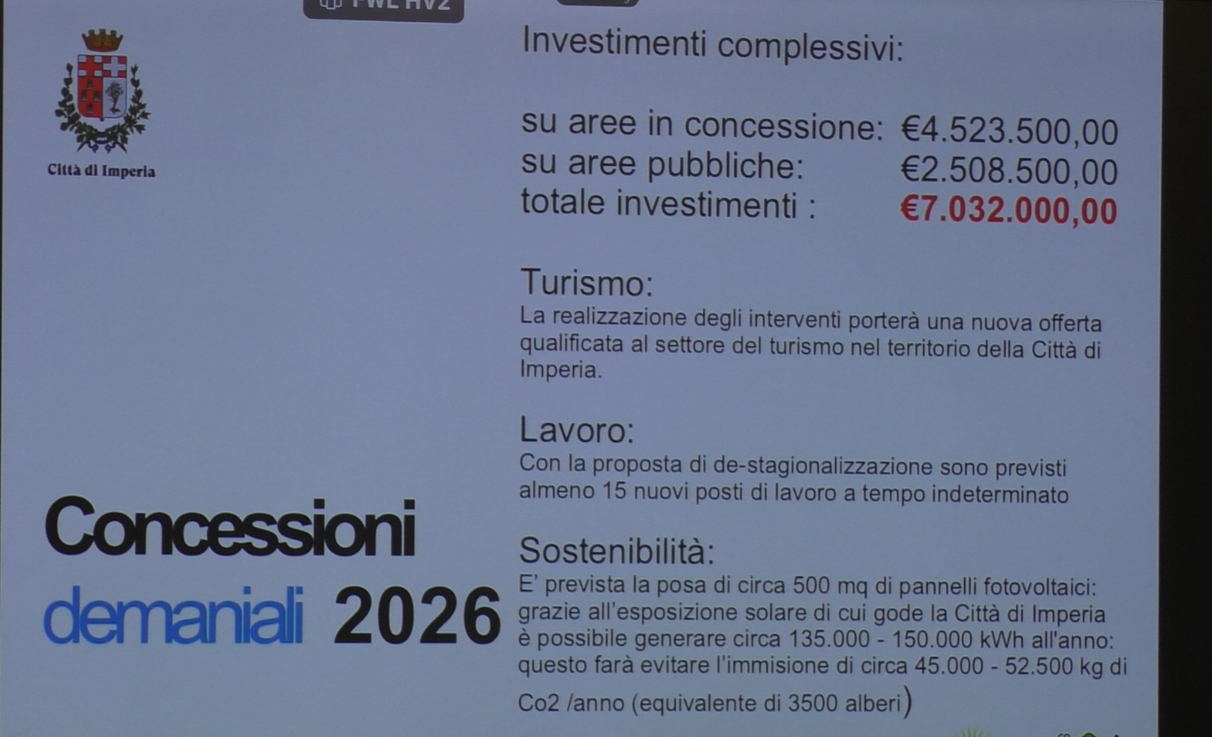 Nel caso di Imperia, le concessioni avranno in gran parte una durata di circa vent’anni. “L’investimento lo fa il privato. Il valore complessivo degli interventi sfiora i 7 milioni e mezzo di euro, attraverso finanziati dai privati, in un contesto in cui i fondi del PNRR si esauriranno nel 2026. I prossimi investimenti sono a carico degli imprenditori locali”. Gli investimenti riguardano 4,5 milioni su aree in concessione e 2,5 milioni su aree pubbliche.