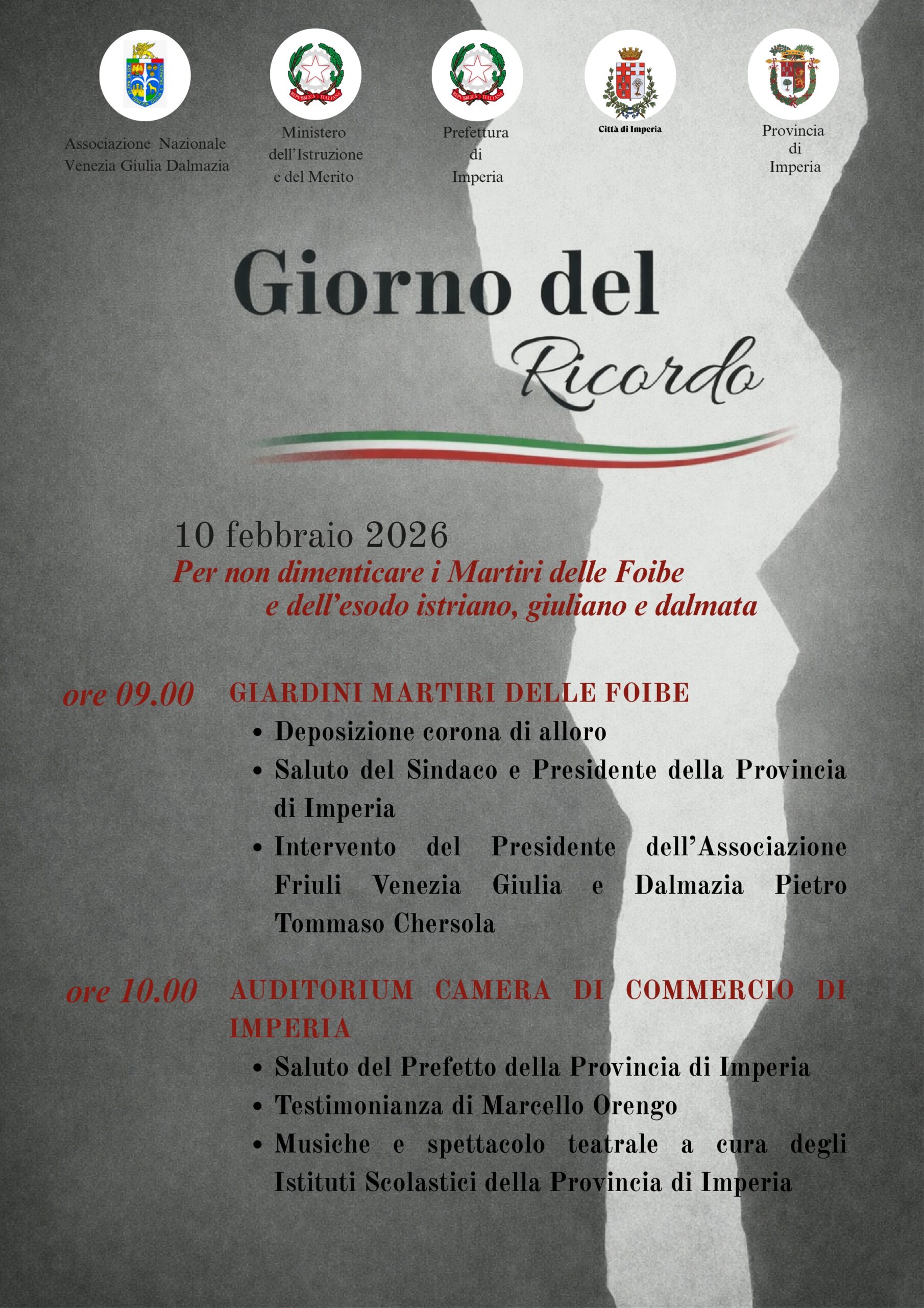 In particolare, la commemorazione avrà luogo martedì 10 febbraio a partire dalle ore 9.00, presso i Giardini Martiri delle Foibe dove sarà deposta una corona d’alloro. Seguiranno gli interventi del sindaco e presidente della Provincia di Imperia e del presidente dell’Associazione Venezia Giulia e Dalmazia.
