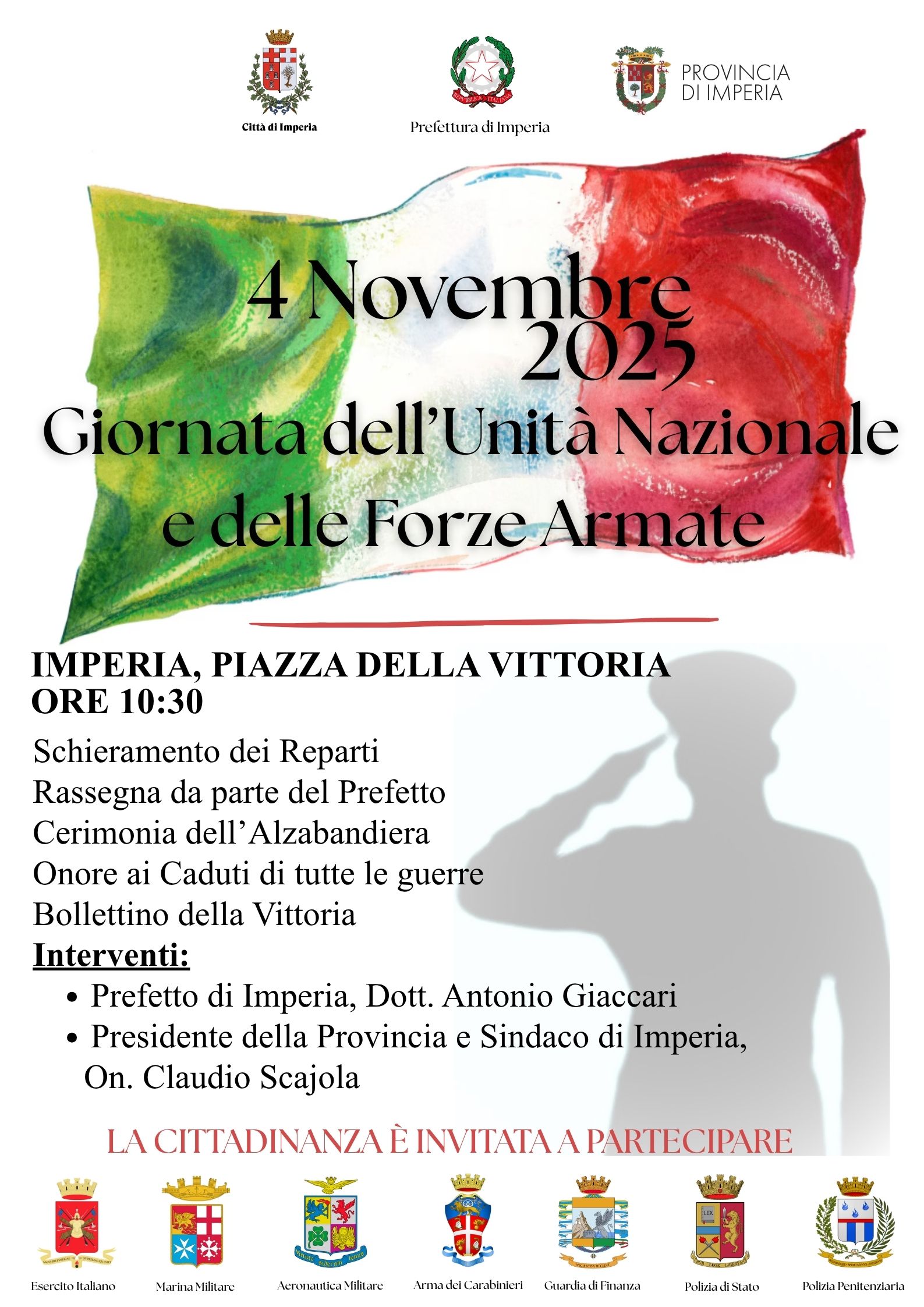Martedì 4 novembre si terrà a Imperia, in piazza della Vittoria, la cerimonia istituzionale provinciale in occasione della Giornata dell’Unità nazionale e delle Forze armate. L’evento vedrà la partecipazione delle autorità militari, civili e religiose, delle rappresentanze scolastiche e della cittadinanza.