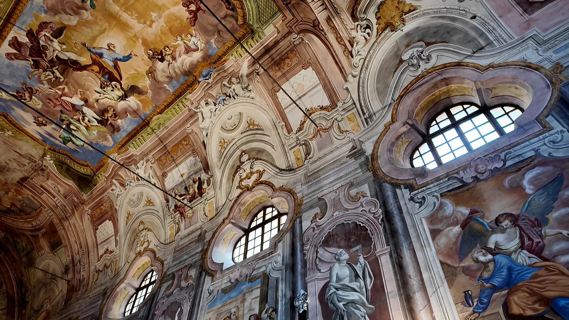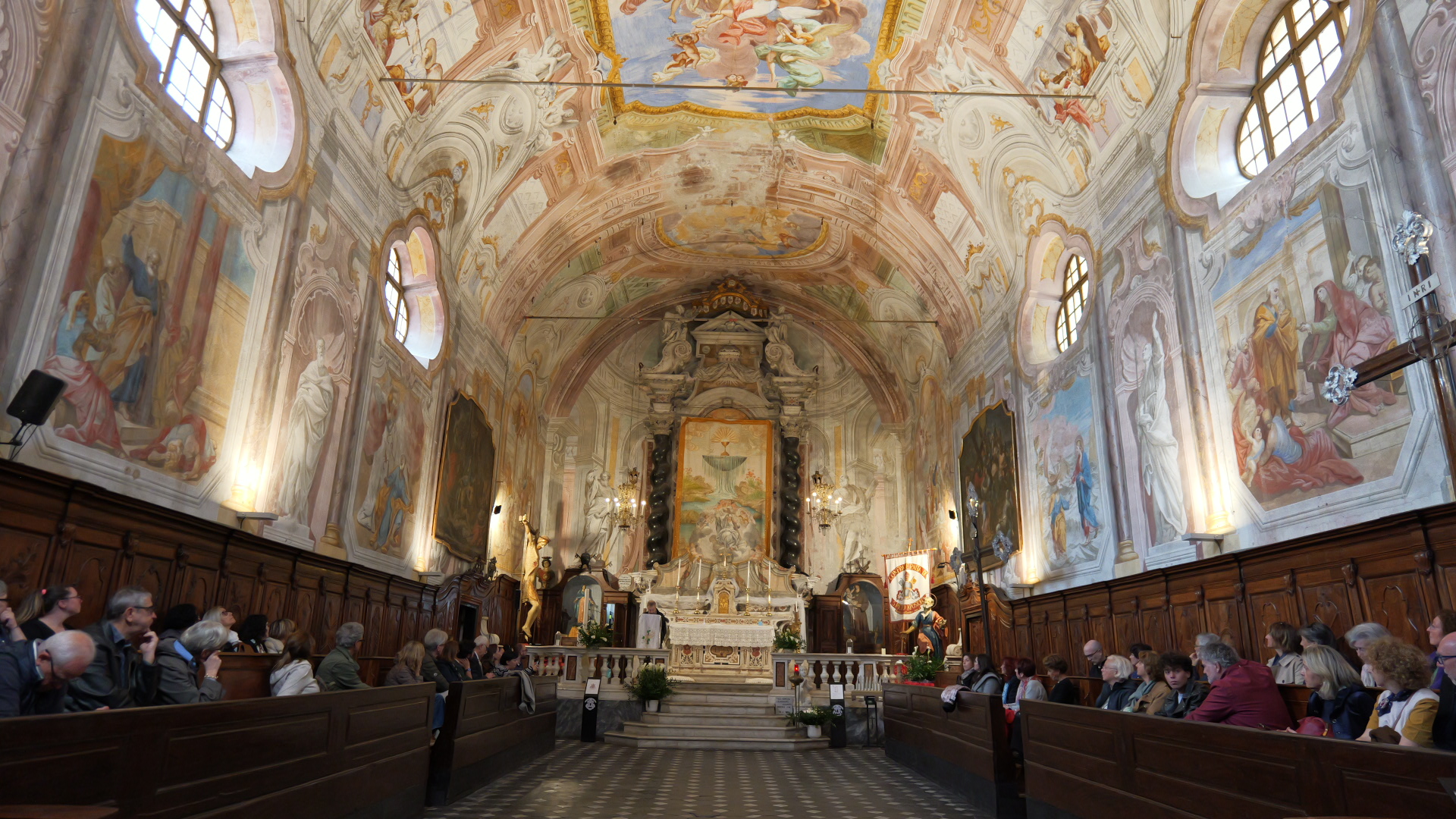 L’oratorio, nella forma attuale, nasce nel 1601, per poi essere arricchito alla fine del Settecento con decorazioni barocche. Questo intervento tardivo ha trasformato l’interno in una vera e propria scenografia religiosa: “Una rappresentazione pensata per raccontare ai fedeli le leggi fondamentali del cattolicesimo”, spiega Oreggia.
