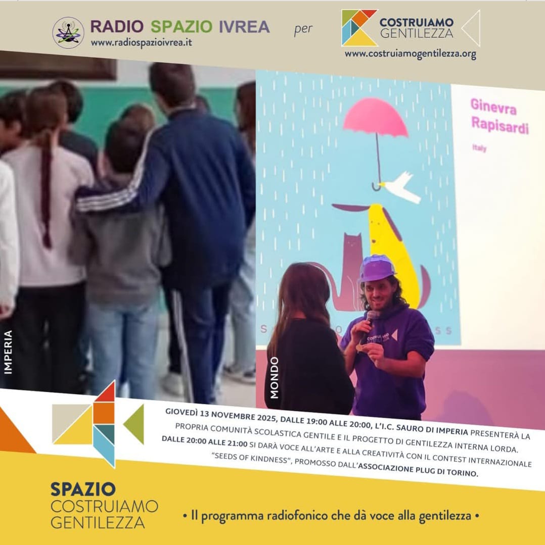 In occasione della Giornata mondiale della gentilezza, giovedì 13 dicembre dalle ore 19.00 alle ore 20.00, su Radio Spazio Ivrea (www.radiospazioivrea.it), gli studenti dell’I.C. “N. Sauro” a indirizzo musicale di Imperia saranno protagonisti della trasmissione “Spazio costruiamo gentilezza”.
