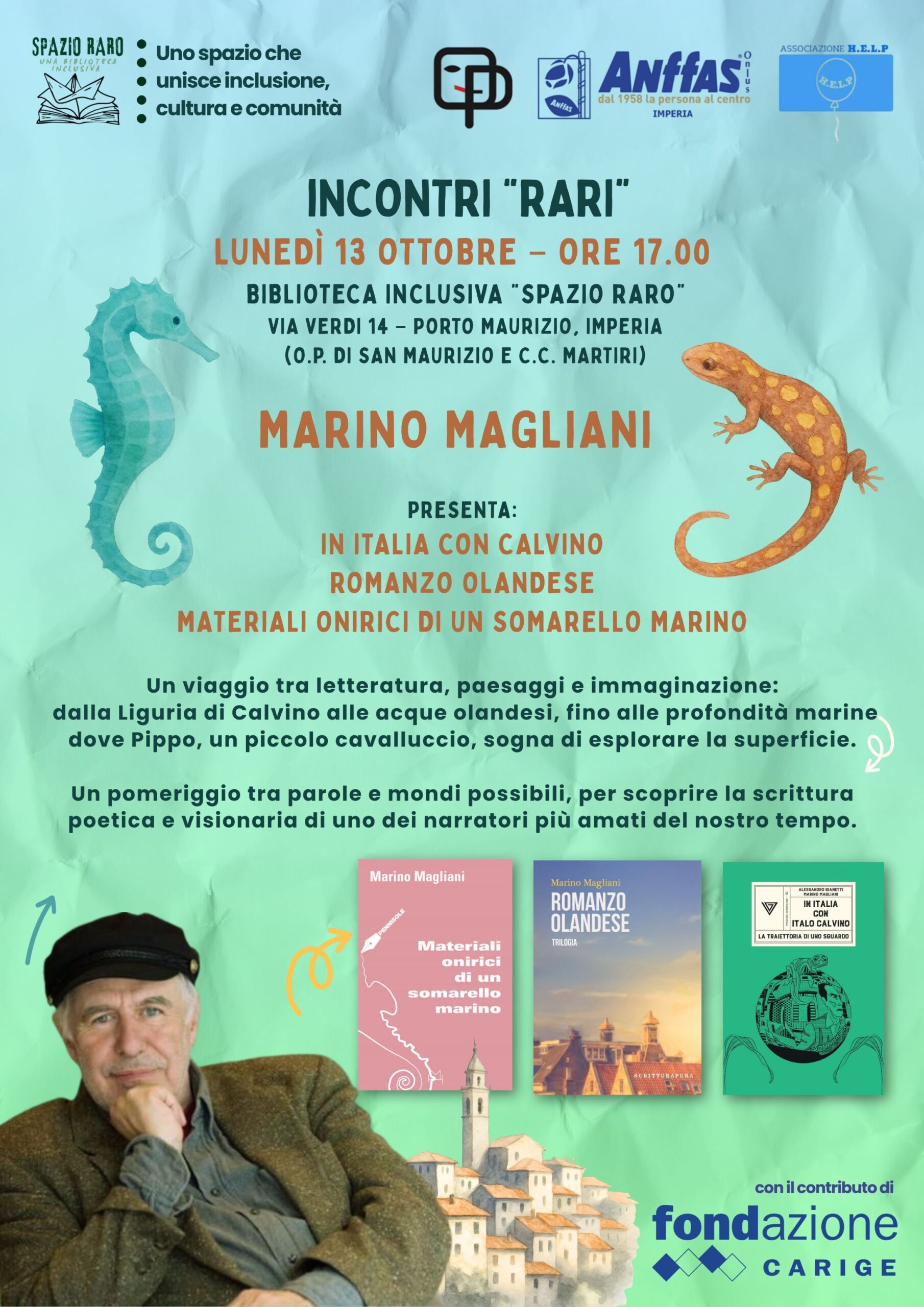 Lunedì 13 ottobre alle ore 17.00 lo scrittore Marino Magliani sarà ospite della biblioteca inclusiva Spazio raro, in via Verdi n. 14 a Imperia. L’autore ligure di fama internazionale presenterà al pubblico tre delle sue opere più significative: In Italia con Calvino, Romanzo olandese e Materiali onirici.