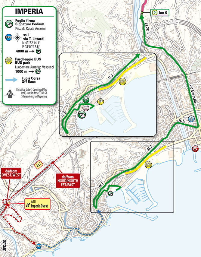 Partenza Calata Anselmi verso le 13:00, i corridori si immetteranno in via Scarincio per proseguire in via Pirinoli. Svolteranno a destra sull’Aurelia, passeranno davanti alla pensilina di Porto Maurizio. Si prosegue in via Siffredi, via Battaglione alpini Pieve di Teco, percorreranno l’Aurelia fino a Piazza Dante, passando davanti al Comune e proseguiranno in piazza Dante. Da lì svolteranno a sinistra attraverso via Largo Nannolo Piana e successivamente in via Berio, via Garessio, rotonda autostrada, via Nazionale per proseguire in direzione Pieve di Teco, successivamente in direzione Albenga per proseguire verso Savona ed andare a Novi Ligure dove ci sarà l’arrivo.