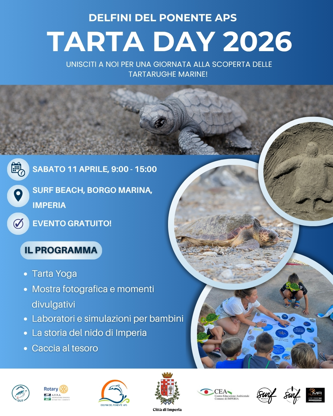 Un sentito ringraziamento va a tutti i partner che hanno contribuito alla realizzazione dell’evento: GLIT – Gruppo Ligure Tartarughe Marine, Associazione Europea Rotary per l’Ambiente (A.E.R.A.), Città di Imperia, CEA – Centro di Educazione Ambientale del Comune di Imperia, Surf Beach, Imperia Diano Surf e MFI My Future Innovation, per il supporto e la collaborazione nella promozione della tutela del mare e della biodiversità .