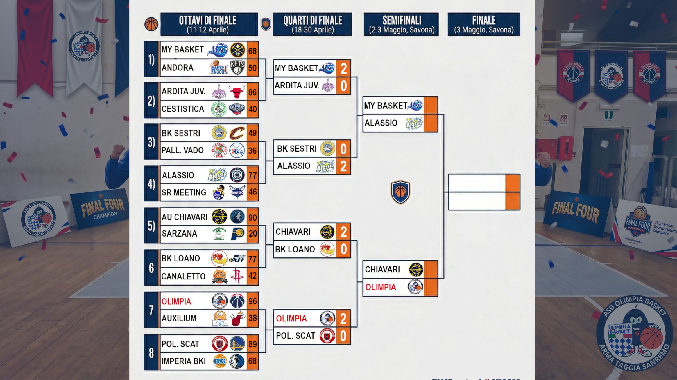 Nel campionato regionale, che la federazione ha dedicato come di consueto alle franchigie della NBA, lâOlimpia âWizardsâ domina il girone del Ponente ligure con 17 vittorie e 1 sconfitta, poi elimina in gara secca lâAuxilium âHeatsâ di Genova agli ottavi di finale e si impone due volte contro i âWarriorsâ della S. Caterina. Ora si trova fra le migliori quattro della Liguria; con loro i âClippersâ di Alassio, i âNuggetsâ del MyBasket Genova e i âTimberwolvesâ di Chiavari. Proprio questi ultimi, dominatori del girone del Levante, saranno gli sfidanti nelle semifinali di sabato 2 maggio.
