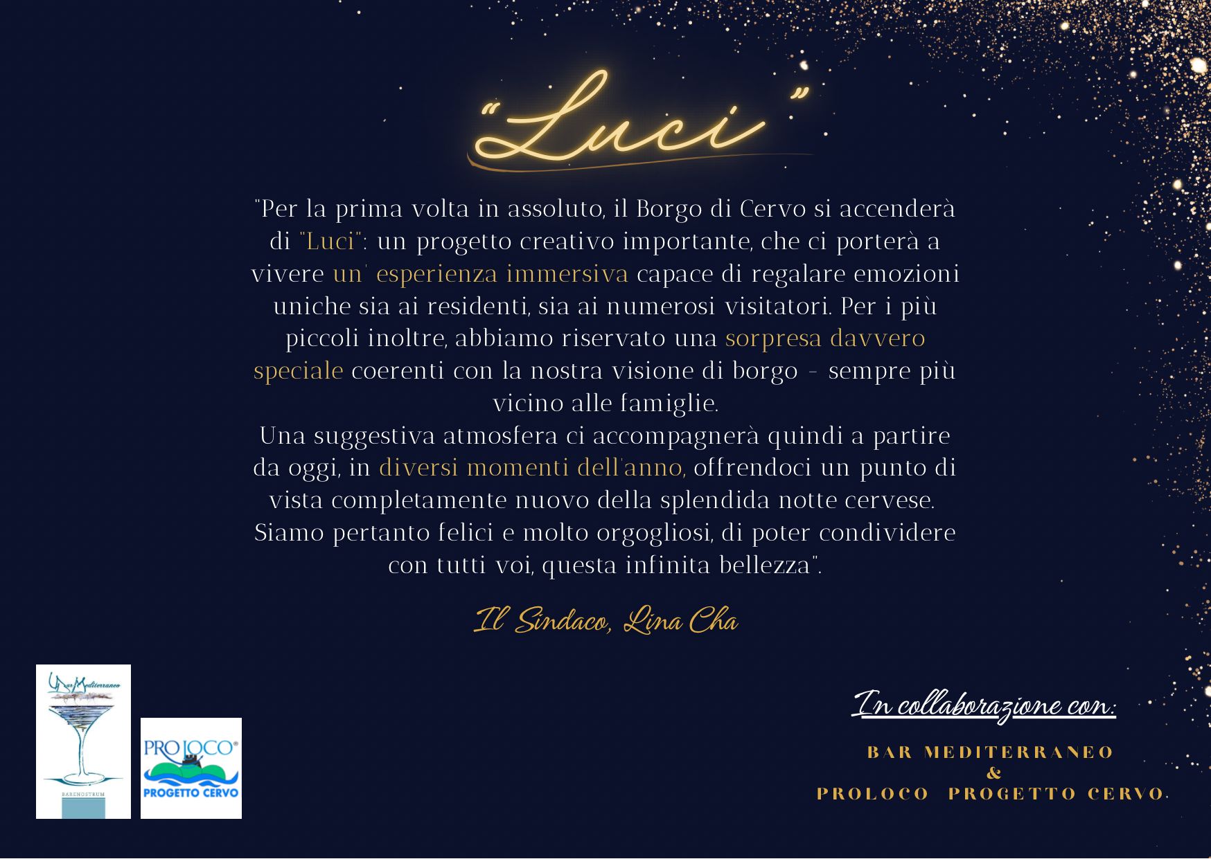 Come dichiarato dal sindaco Lina Cha, “‘Luci’ nasce per trasformare le serate cervesi in un vero e proprio viaggio emozionale. Le installazioni, attive in diversi momenti dell’anno, offriranno una nuova prospettiva sulla notte del borgo, arricchendo la già suggestiva scenografia storica con proiezioni artistiche e punti luce diffusi“.