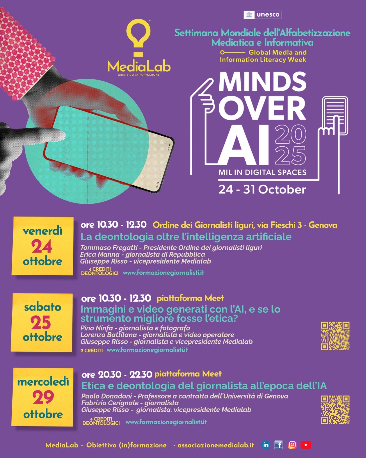 Per stimolare il dibattito su questo tema, MediaLab – in occasione della MIL Week 2025 – ha programmato tre appuntamenti in presenza e online, dal 24 al 29 ottobre, validi anche per la formazione professionale continua. I giornalisti che intendono partecipare possono registrarsi attraverso la piattaforma di formazione professionale continua www.formazionegiornalisti.it. Gli eventi online sono aperti a tutti, non solo ai giornalisti.