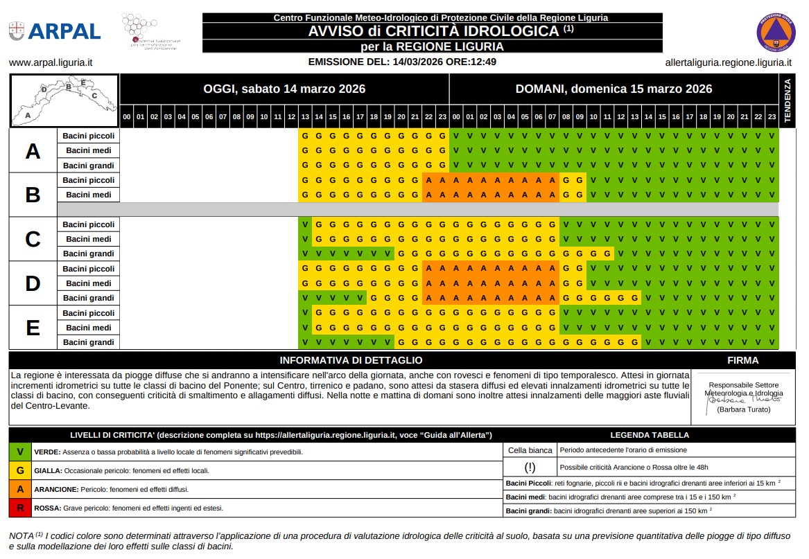- Su tutte le classi di bacino di B e D l’allerta idrologica diventerà arancione dalle 22:00 di questa sera fino alle 8:00 di domani, domenica 15 marzo, a cui seguirà una gialla fino alle 10:00 di domani (fino alle 14:00 sui bacini grandi di D).