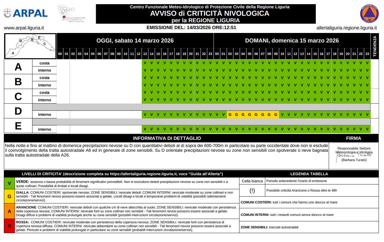 - Su D scatta anche l’allerta gialla per neve dalle 2:00 alle 10:00 di domani, domenica 15 marzo.