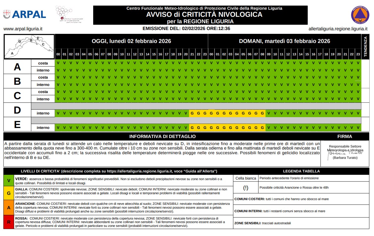 Si segnalano infatti dalla serata deboli nevicate nell’entroterra con quota neve in calo fino al suolo su D e su parte orientale di E. Le nevicate proseguiranno fino alle prime ore della mattina di domani con accumuli sui versanti padani del savonese moderati su zone non sensibili e deboli sui tracciati autostradali (fino a 8-10 cm sulla Savona-Torino), mentre su E si attendono circa 2-4 cm sulle zone sensibili. Si segnalano inoltre possibili episodi di gelicidio, più probabili nelle zone interne del centro della regione (es. Valle Scrivia, Valle Stura).