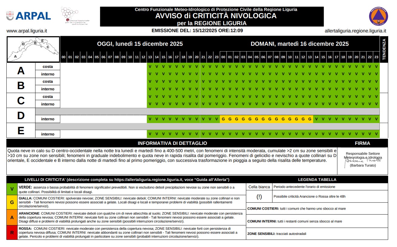 Nella notte leprecipitazioni saranno deboli diffuse, in progressiva intensificazione fino a moderate nella prima parte della giornata di domani, martedì 16 dicembre, a partire da Ponente ed in estensione al resto della regione, con coinvolgimento del levante fino al pomeriggio.