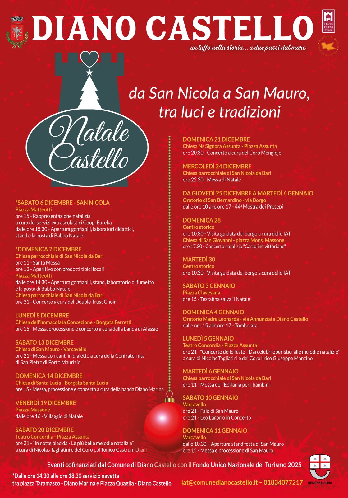 Orari di apertura dal 6 all’8 dicembre e dal 20 dicembre al 6 gennaio: dalle ore 10 alle 17. Chiuso il 25 dicembre e il 1° gennaio. Orario breve il 26 e il 31 dicembre: 10-13. Info: 0183.4077217 – iat@comunedianocastello.it.