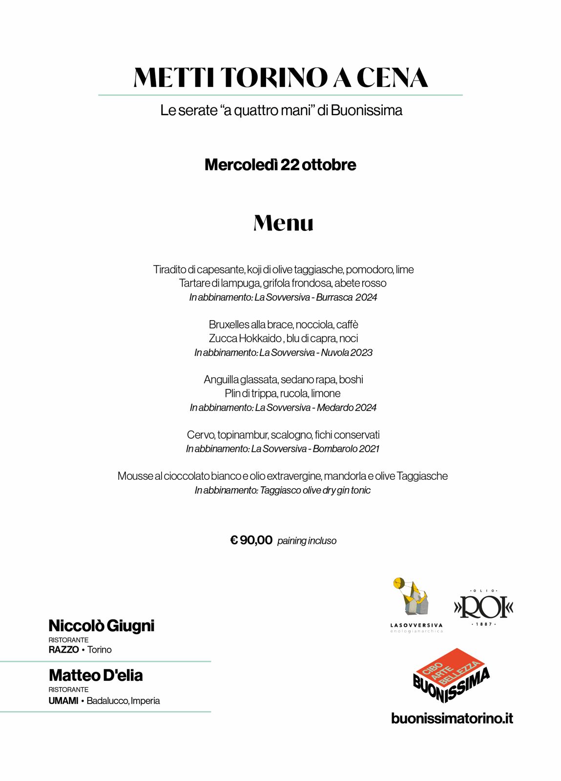 La prima serata si terrà il 22 ottobre da Razzo Torino, locale che ha saputo distinguersi in città per la sua cucina vivace, sperimentale e sempre attenta all’innovazione. Protagonisti saranno Matteo D’Elia, chef dell’Umami Restaurant di Badalucco, ristorante gourmet che unisce creatività e rispetto della materia prima, e Niccolò Giugni, chef di casa al Razzo. Insieme proporranno un percorso brioso e sorprendente, fatto di contaminazioni e tecniche a confronto, in cui la sensibilità ligure incontrerà l’energia torinese. A impreziosire la serata saranno i vini della cantina ligure La Sovversiva, giovani etichette dal carattere deciso e contemporaneo.