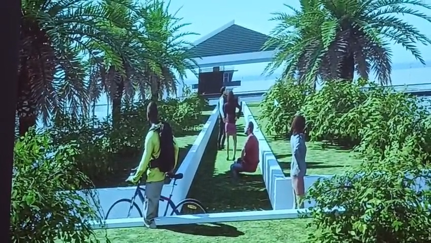 Il progetto include inoltre un parco urbano collegato alla pista ciclopedonale, stabilimenti balneari coperti da pannelli fotovoltaici, mini pale eoliche sulla diga foranea e una torre servizi, con distributore di carburante e collegamento marittimo passeggeri.