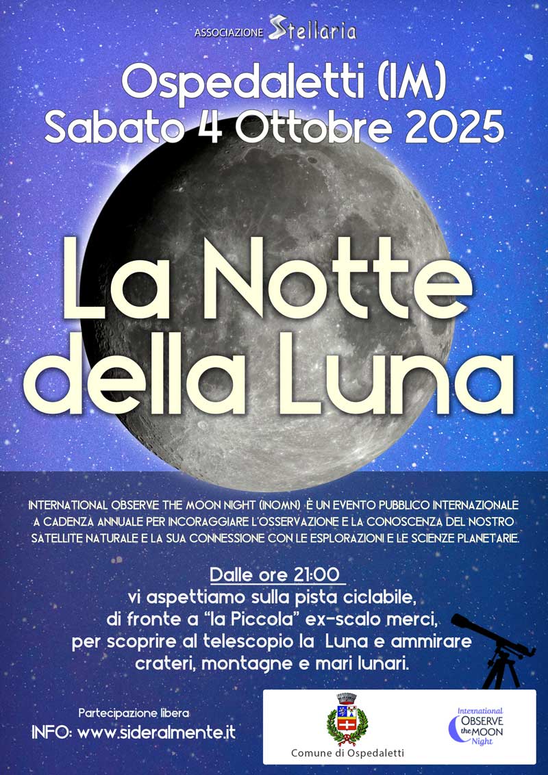 L’evento organizzato dall’associazione Stellaria e dal Comune di Ospedaletti si inserisce in un’iniziativa globale patrocinata dalla NASA che ogni anno coinvolge migliaia di appassionati, scuole, osservatori e centri culturali in tutto il mondo, con l’obiettivo di promuovere la conoscenza e l’osservazione del nostro satellite naturale.Â