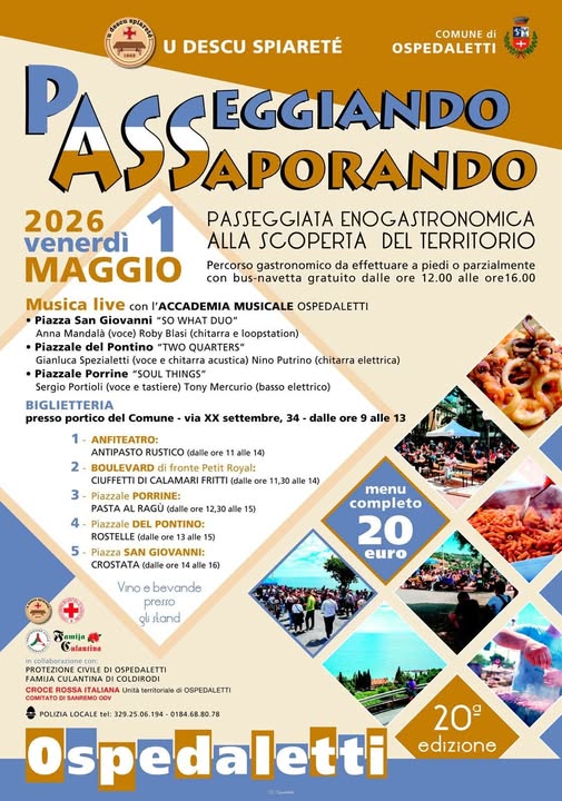 In ogni punto di ristoro sono previsti vino e bevande, per un ‘tutto compreso’ al costo di 20 euro a persona. La biglietteria, gestita come l’organizzazione dell’intero evento da parte del Descu Spiaretè, sarà aperta la mattina stessa del 1° maggio sotto il portico del Municipio dalle ore 9 alle ore 13. È prevista la partecipazione dell’Accademia Musicale di Ospedaletti con musica live in piazza San Giovanni, nel piazzale del Pontino e in quello delle Porrine.