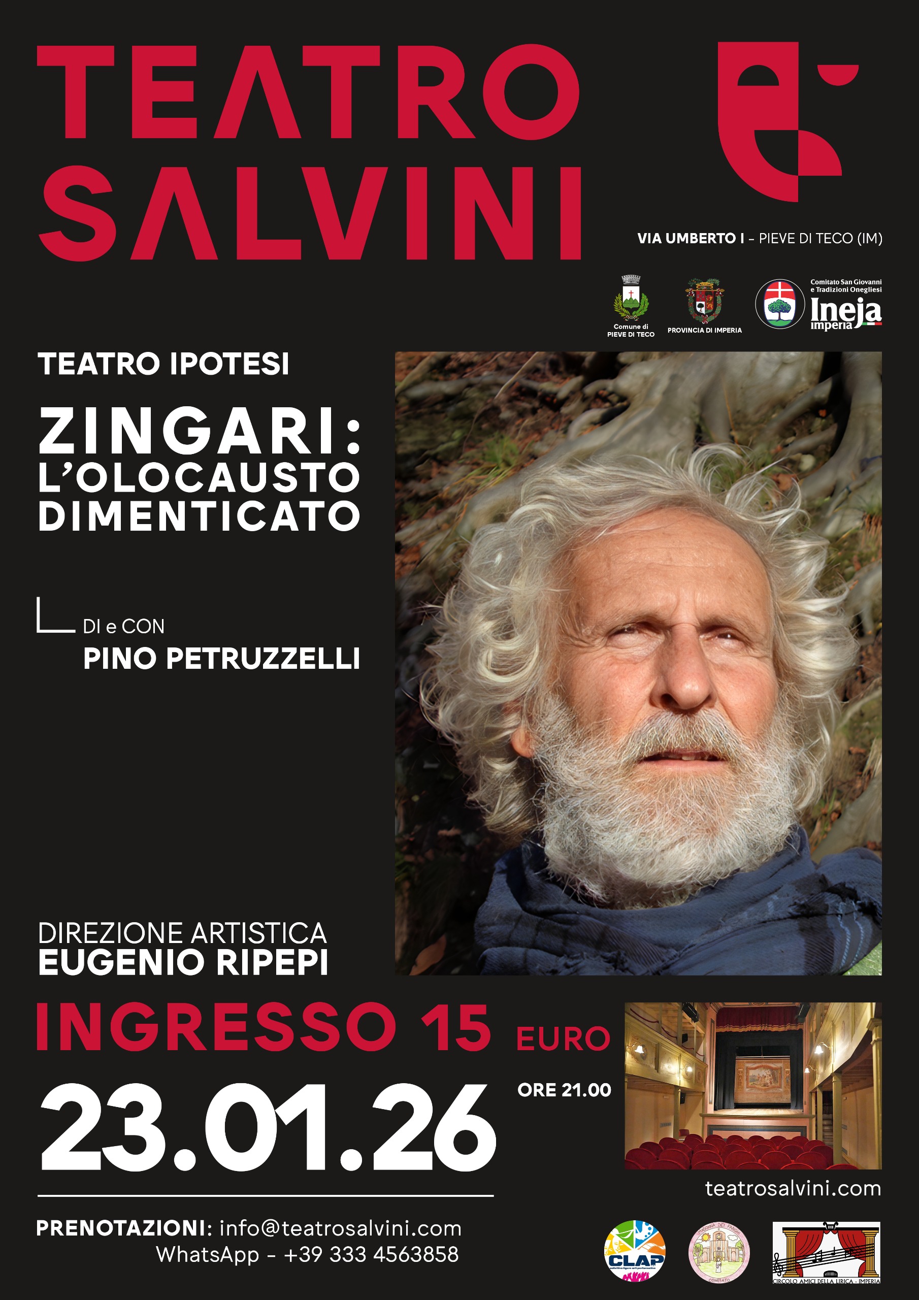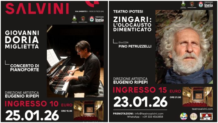 Il mese di gennaio, cominciato con Francesco Pannofino, Enzo Paci e Settimio Benedusi, si chiude, al Teatro Salvini di Pieve di Teco per il cartellone diretto da Eugenio Ripepi e organizzato con il Comitato San Giovanni e Tradizioni Onegliesi, con il supporto del Comitato Madonna dei Fanghi di Pieve di Teco e la collaborazione di CLAP Aps, con il sostegno del Comune di Pieve di Teco e il patrocinio dalla Provincia di Imperia, con due eventi in questo weekend: il 23 gennaio ‘Zingari – L’olocausto dimenticato’, di e con Pino Petruzzelli, e il 25 gennaio il concerto di pianoforte di Giovanni Doria Miglietta.