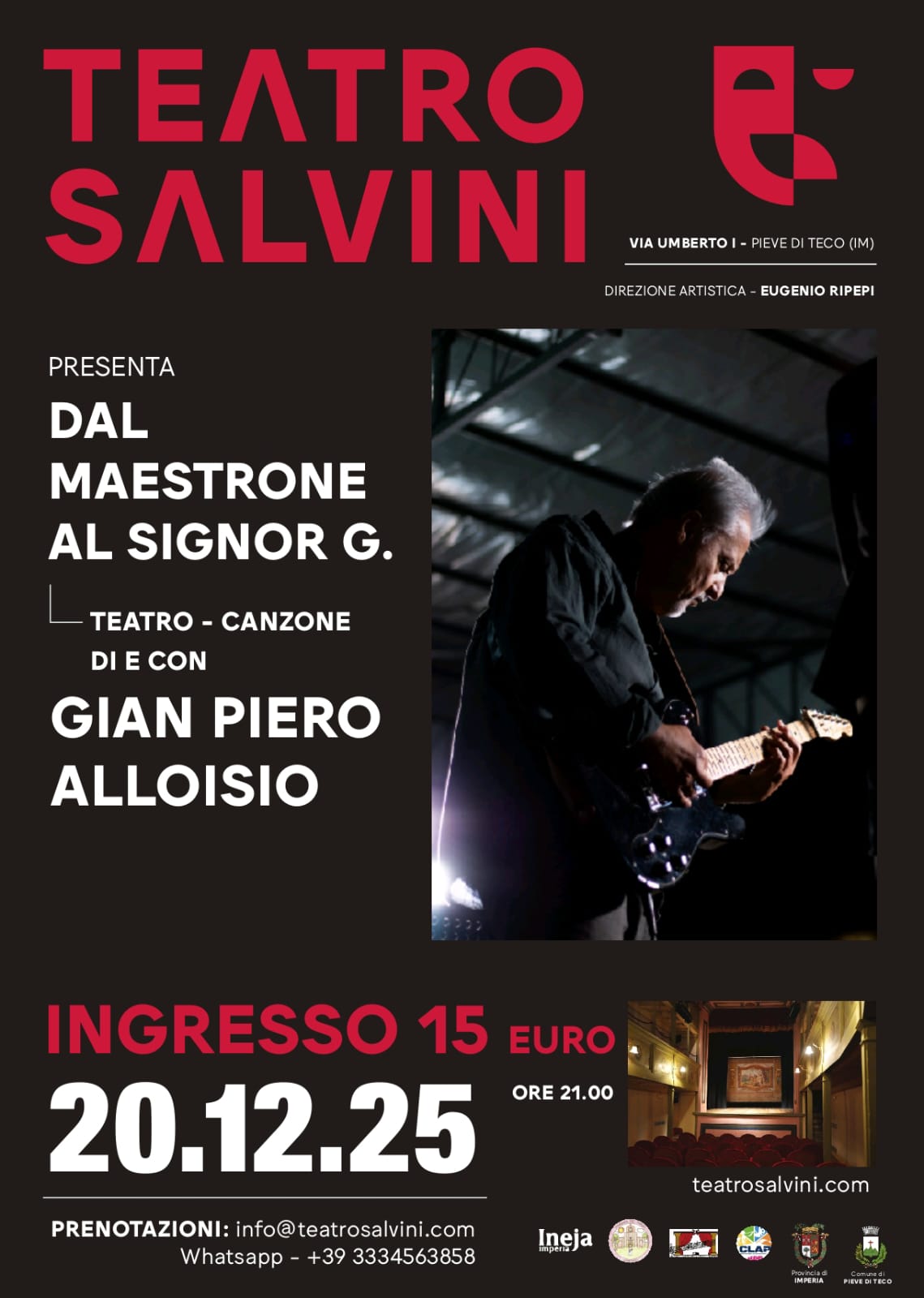 Sabato 20 dicembre alle 21 va in scena “Dal Maestrone al Signor G.”, Teatro Canzone di e con Gian Piero Alloisio. Gian Piero Alloisio ha lavorato a lungo, in qualità di autore e interprete, con due giganti della cultura musicale e teatrale italiana: Francesco Guccini e Giorgio Gaber. Con questi iconici artisti ha scritto varie canzoni, fra cui alcune hit come la poetica “Venezia” per Guccini o la comicissima “La strana famiglia” per la formidabile coppia Giorgio Gaber ed Enzo Jannacci. In un percorso in cui si alternano canzoni divertenti, e canzoni di grande spessore emotivo o di impegno civile, Alloisio ci racconta tanti episodi vissuti accanto al Maestrone – così i musicisti chiamano Francesco Guccini – e al Signor G. – come amava definirsi Giorgio Gaber. Sono racconti lievi, ma sempre interessanti, che rivelano aspetti curiosi e poco noti di due grandi artisti che, come vedremo, a un certo punto lavorarono insieme al progetto “Ultimi viaggi di Gulliver”. In questo percorso si racconta anche di altri artisti “visti da vicino” come Gianni Morandi e Fabrizio De André. Fra le numerose canzoni, oltre a “Venezia” e “La strana famiglia”, anche “Marilyn”, “Gulliver”, “Dovevo fare del cinema”, “King”, “Ogni vita è grande”, e altre. Inoltre Alloisio farà un omaggio alla sorella Roberta – cantante di world music scomparsa prematuramente.