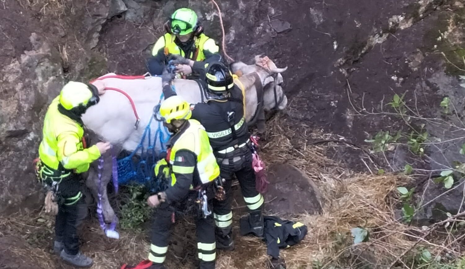 L’operazione si è conclusa con successo: la mucca è stata imbragata e sollevata in sicurezza, quindi trasportata in una zona idonea dove è stata sottoposta a ulteriori controlli veterinari prima di essere riconsegnata ai proprietari.