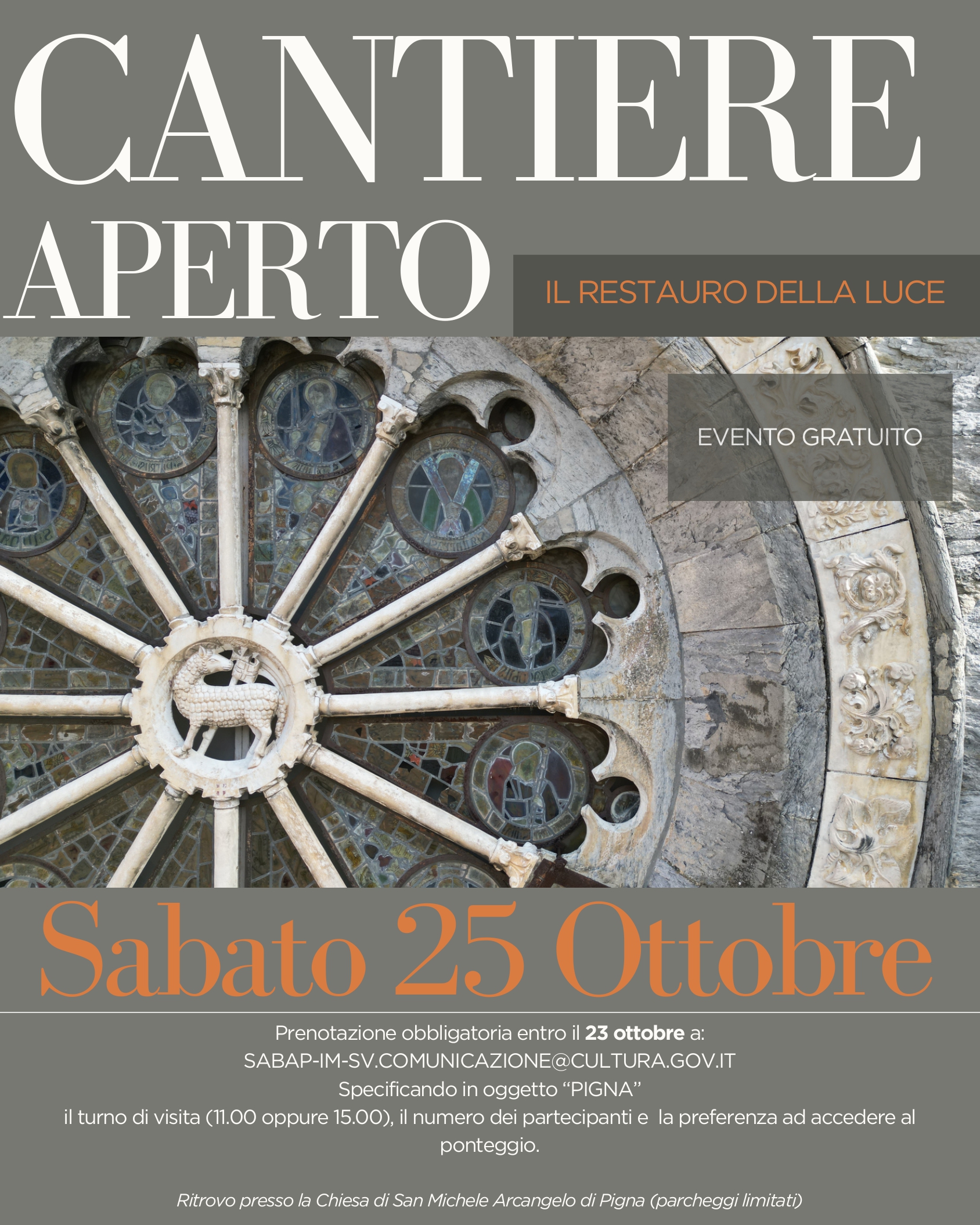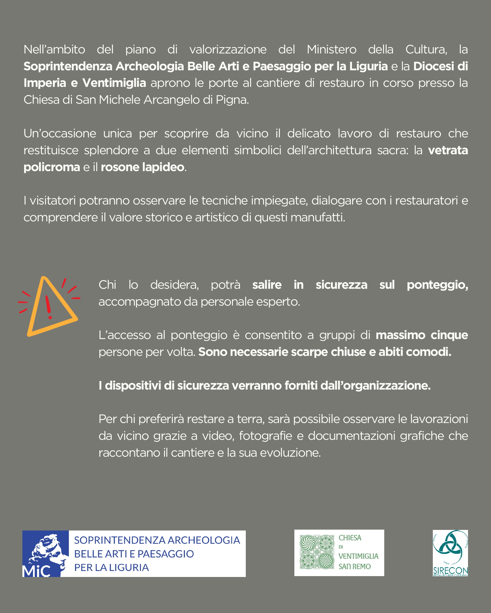 Sabato 25 ottobre la Soprintendenza archeologia, belle arti e paesaggio della Liguria, in collaborazione con la parrocchia di San Michele Arcangelo di Pigna e l’Ufficio beni culturali diocesano, alle ore 11.00 e alle ore 15.00 aprirà le porte al cantiere di restauro in corso, che interessa la vetrata policroma e il rosone lapideo della facciata della chiesa parrocchiale.
