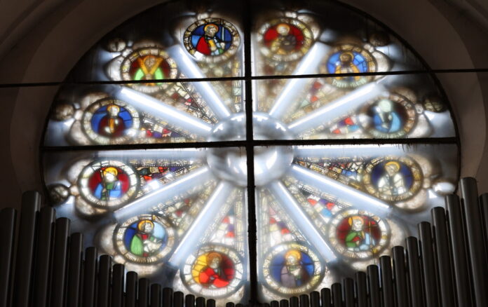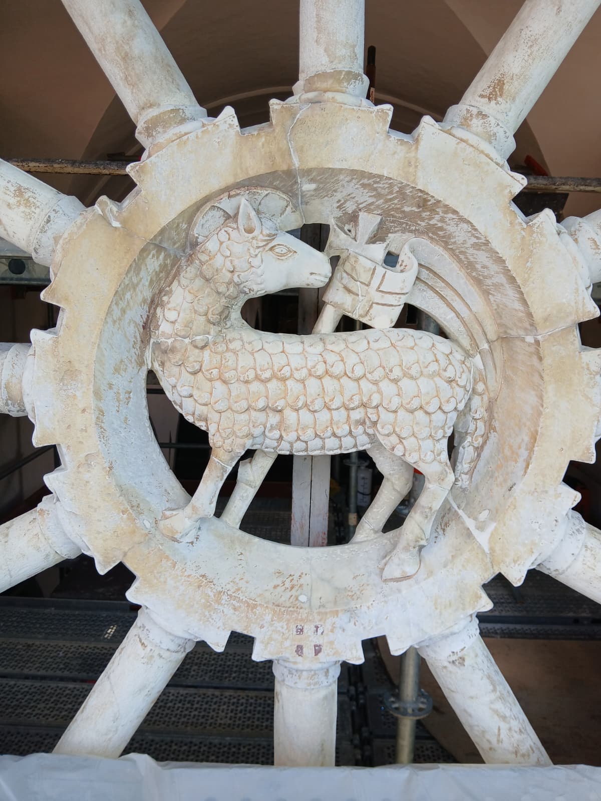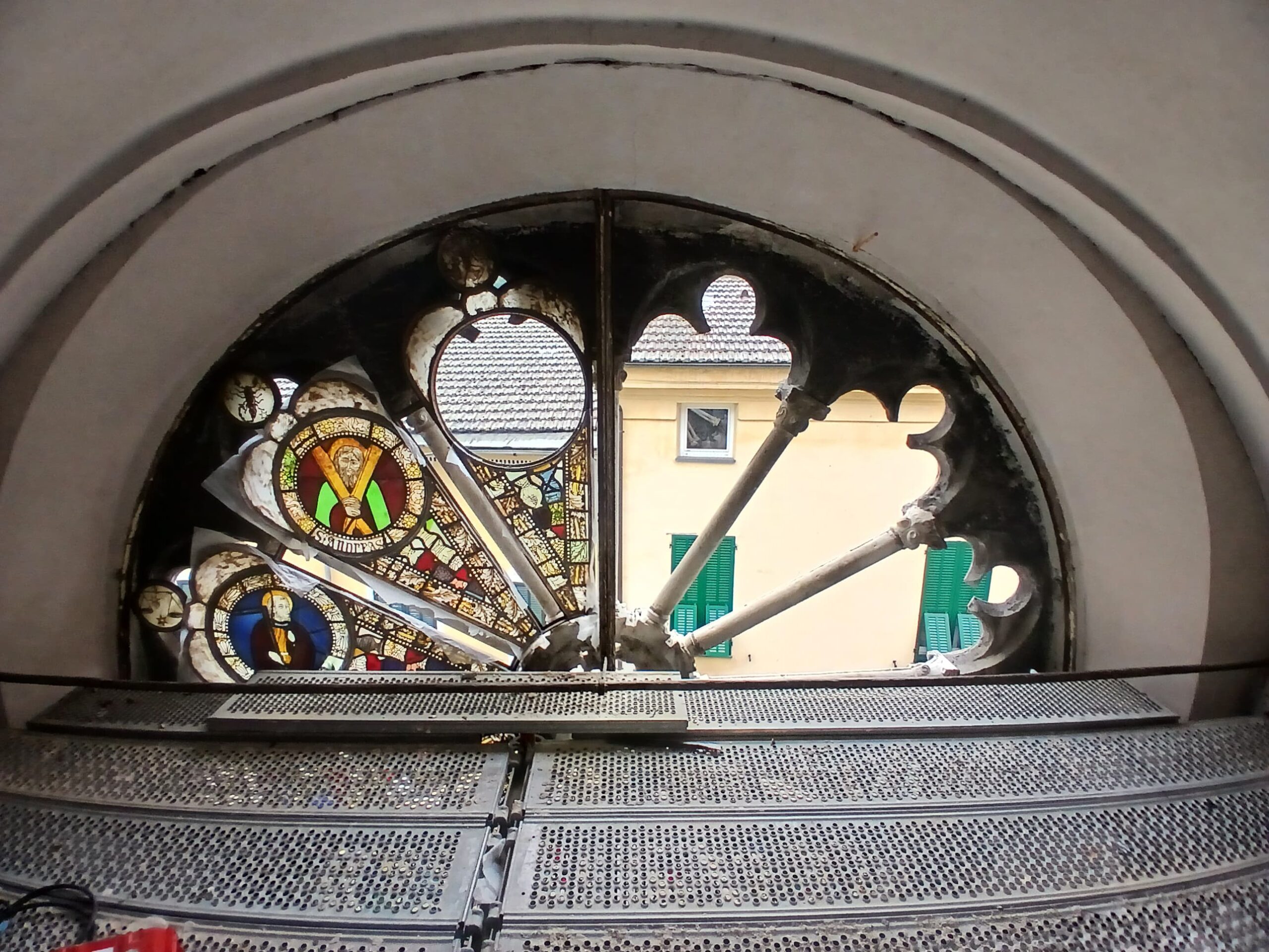 Per la prima volta, infatti, si potrà ammirare da vicino, salendo sui ponteggi, il rosone marmoreo della parrocchiale, accompagnati dalla progettista del lavoro, la funzionaria restauratrice-conservatrice dott.ssa Martina Avogadro, e dalla funzionaria storica dell’arte dott.ssa Francesca De Cupis, coadiuvate dai professionisti della ditta di restauro Sirecon srl. Durante la visita, i restauratori illustreranno anche le fasi di lavorazione della vetrata, attualmente in restauro a Venezia, attraverso immagini e video che documentano il processo conservativo e le tecniche impiegate.