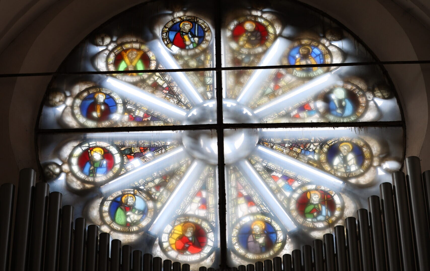Il secondo restauro riguarda la vetrata del rosone, su cui sta agendo la stessa ditta incaricata dei predetti lavori, ma nei propri laboratori veneziani. Un unicum per la Liguria – non se ne conservano anteriori al XVI secolo – da annoverare tra le vetrate istoriate più antiche d’Italia. Il rosone policromo raffigura i dodici apostoli, ciascuno accompagnato da un segno zodiacale, ma ne è ancora ignoto l’autore.