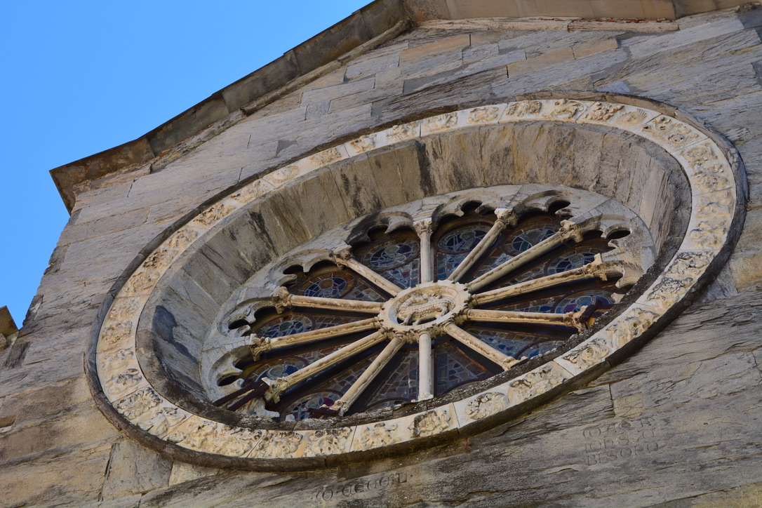 La ruota è suddivisa in dodici spicchi trilobati da raggi a colonna, sormontati da capitelli a crochet, raccordati al centro nella figura dell’Agnello mistico, sotto cui è scolpito un piccolo scudo sabaudo. All’esterno corre una cornice curvilinea articolata in diciannove porzioni, tutte partite in due figurazioni (tranne una che ne ha tre), con motivi fitomorfi e figure enigmatiche, tra cui un volto solare, una figura umana accovacciata, una testa barbata e un grifone passante. Un vero enigma iconografico da ammirare a distanza ravvicinata.