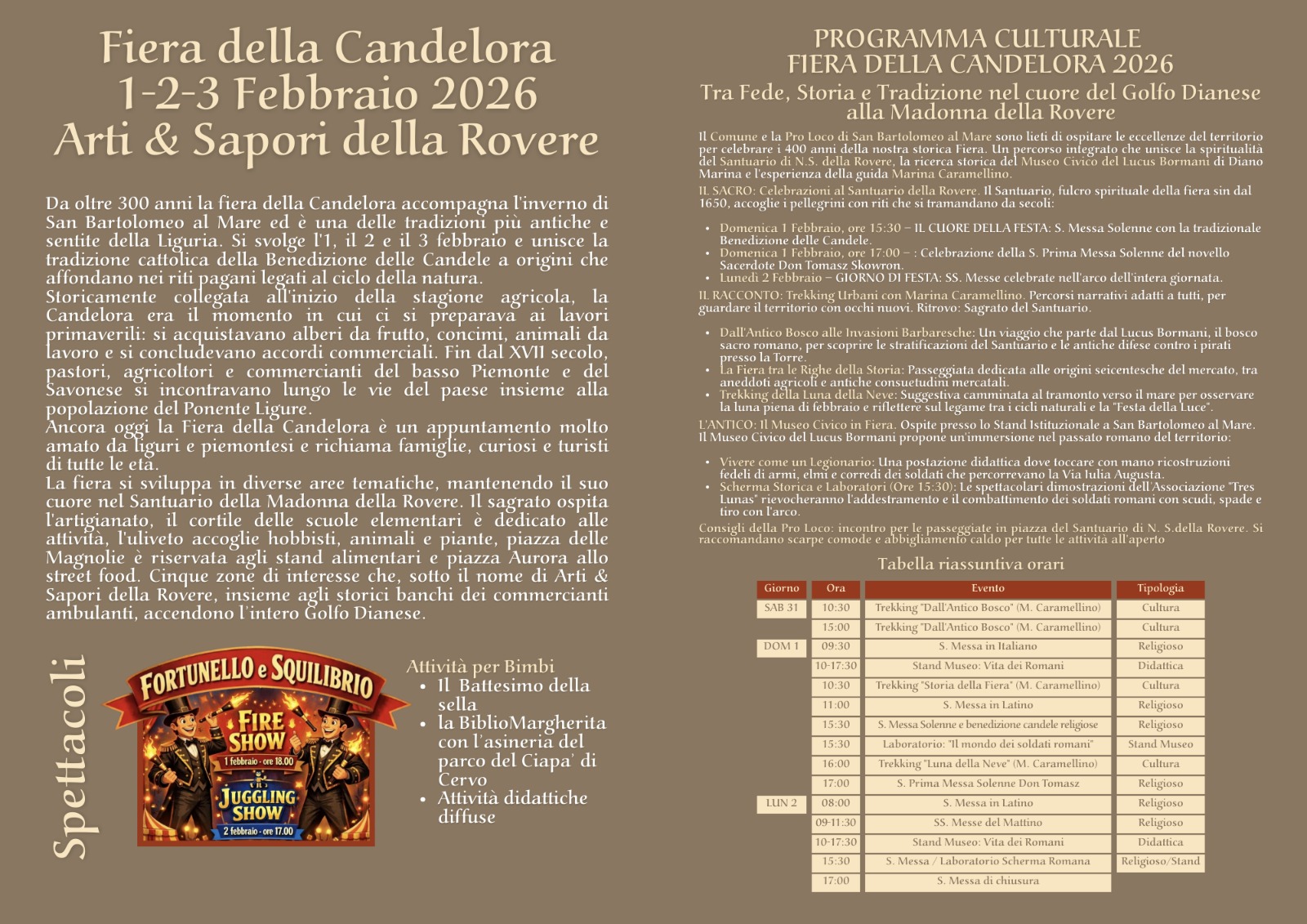 “Come sempre, nei tre giorni di fiera”, spiega il sindaco Filippo Scola, “sono attese migliaia di persone che cammineranno tra i banchi piĂą caratteristici per un evento storico della nostra cittadina. La Candelora è un percorso integrato che unisce la spiritualitĂ del Santuario di Nostra Signora della Rovere, la ricerca storica del Museo Civico del Lucus Bormani di Diano Marina e l’esperienza della guida Marina Caramellino”.