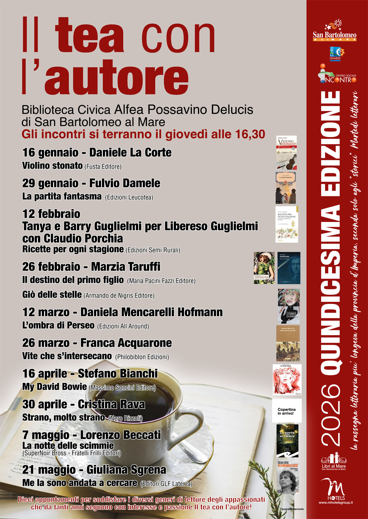Come sempre, questa 15esima edizione si svolge grazie al supporto dell’assessore alla Cultura, Norma Daccò, e dell’amministrazione comunale; all’organizzazione del Centro Sociale Incontro, nella figura della sua presidente Rosanna Brun e della responsabile alla cultura Anna Maria Cortenova; alla collaborazione della Biblioteca Comunale Alfea Possavino Delucis, con Cinzia Dotti, insostituibile bibliotecaria; della libreria Libri al Mare di Antonio Avignone e, infine, di Viviana Spada, curatrice e presentatrice della rassegna, senza dimenticare il sostegno del dott. Fausto Ferreccio di Mhotels per la cortese ospitalità offerta agli autori.