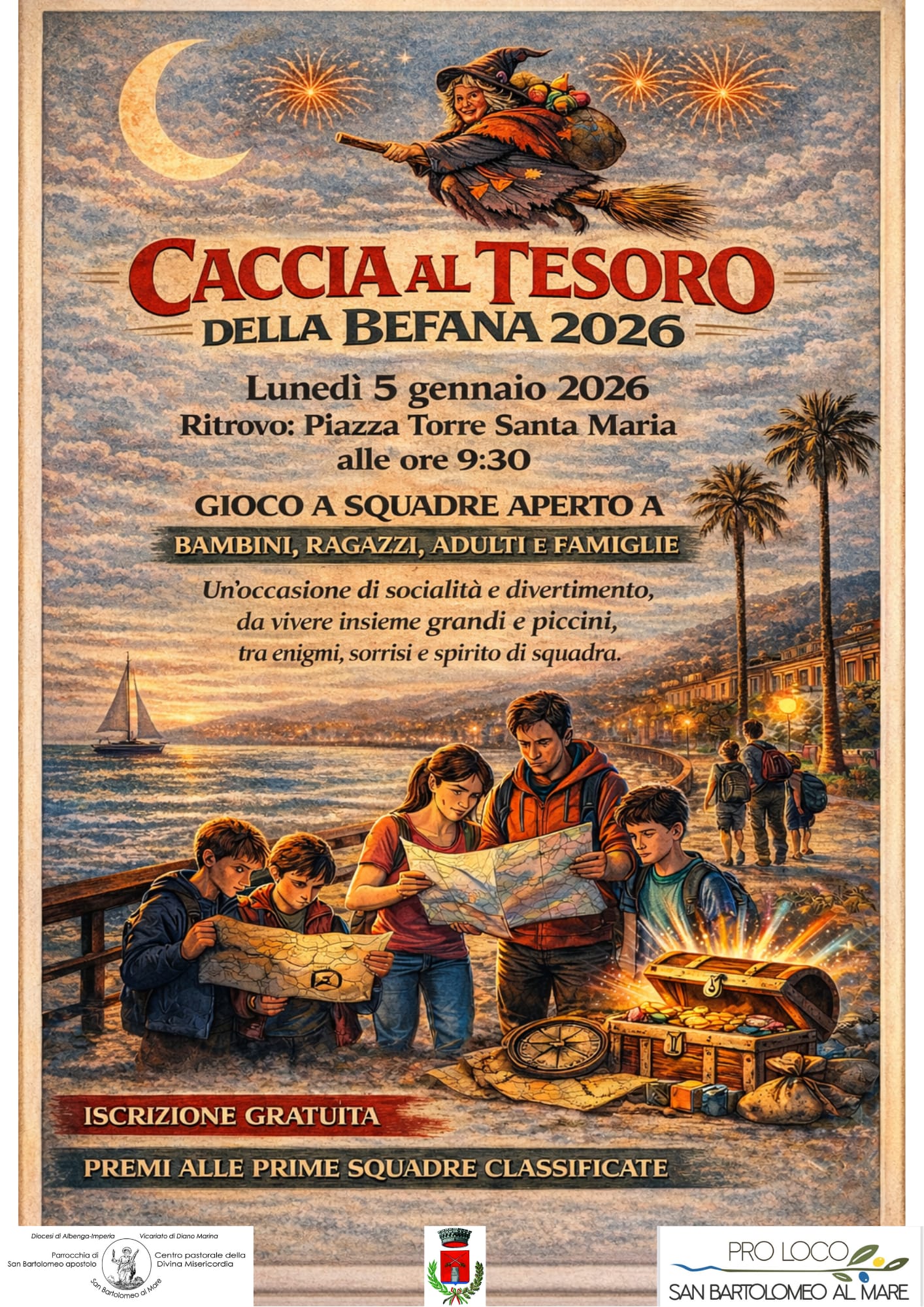 L’evento è organizzato dalla Parrocchia di San Bartolomeo al Mare, in collaborazione con Comune, Pro Loco e associazioni locali, e rientra nel calendario delle iniziative proposte ai turisti presenti in paese tra Natale e l’Epifania. Fondamentale anche il contributo dei ragazzi del gruppo giovani parrocchiale, coinvolti attivamente nell’organizzazione e nella gestione del gioco.