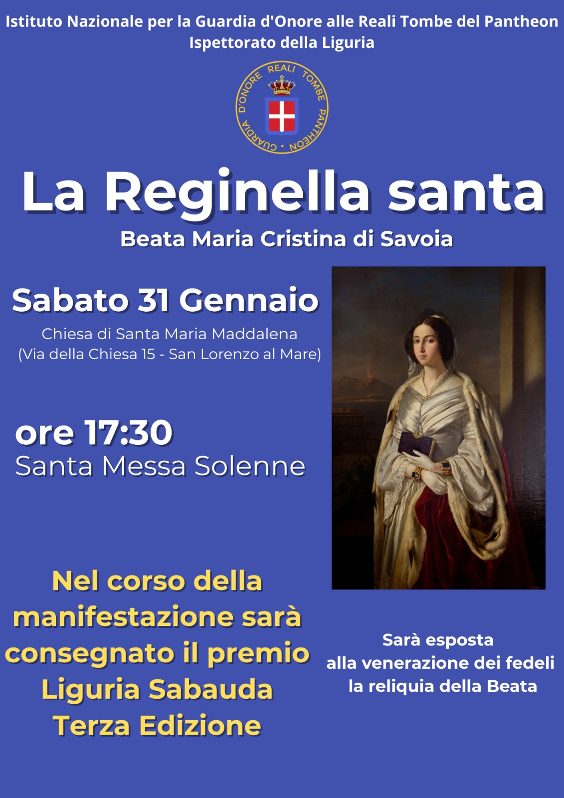 Sabato 31 gennaio sarĂ celebrata la messa solenne, alle ore 17.30 nella chiesa di Santa Maria Maddalena a San Lorenzo al Mare, in occasione della memoria liturgica della Beata Maria Cristina di Savoia, la Reginella Santa.