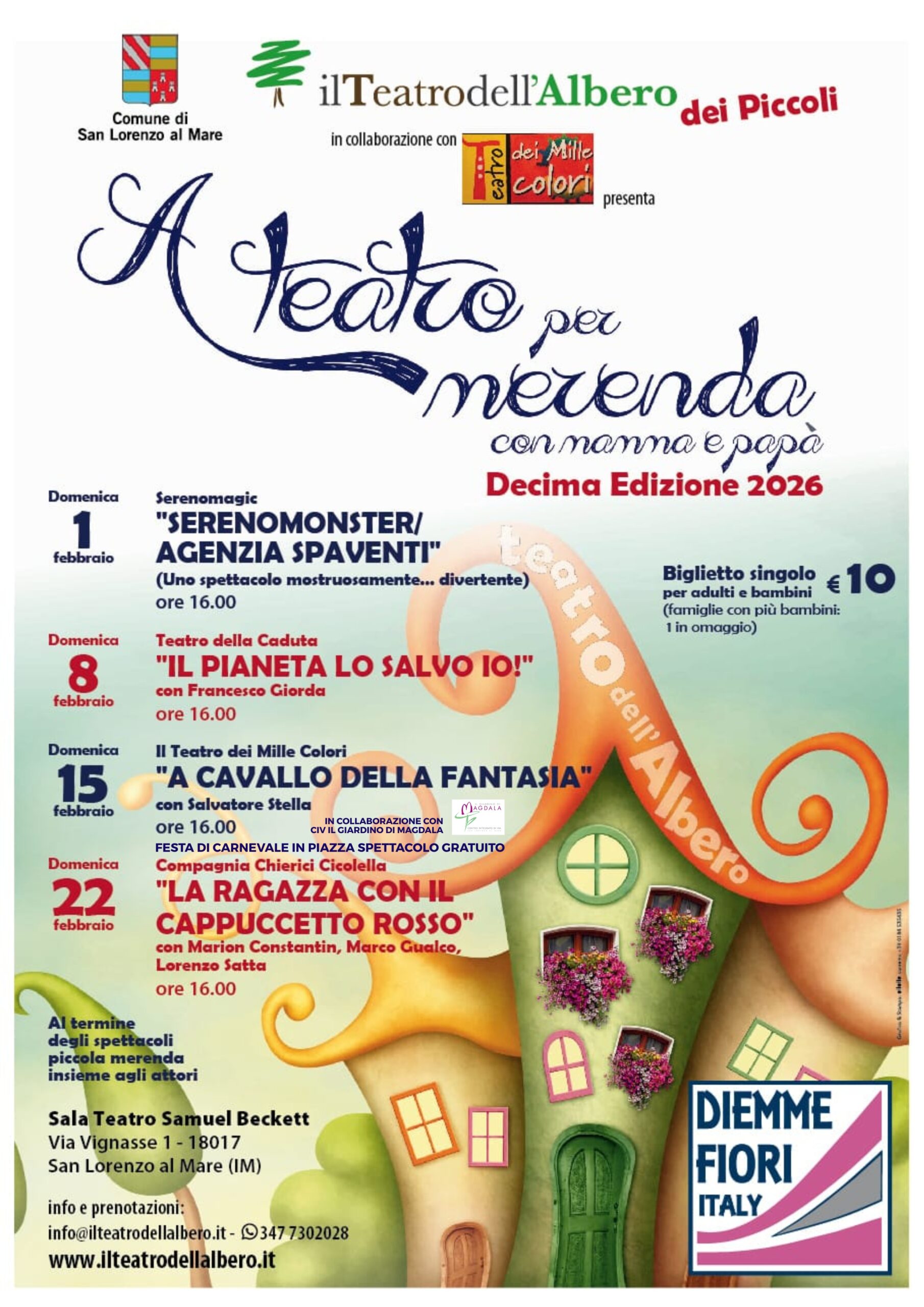 Il progetto trova continuità nella rassegna del Teatro dell’Albero, decima edizione 2026, che si terrà presso la Sala Teatro Samuel Beckett. La rassegna, intitolata “A teatro per merenda con mamma e papà”, presenterà per tutto il mese di febbraio spettacoli adatti a famiglie e bambini. La rassegna è realizzata ogni anno grazie al contributo fondamentale di Diemme Fiori Export e famiglia Di Massa.