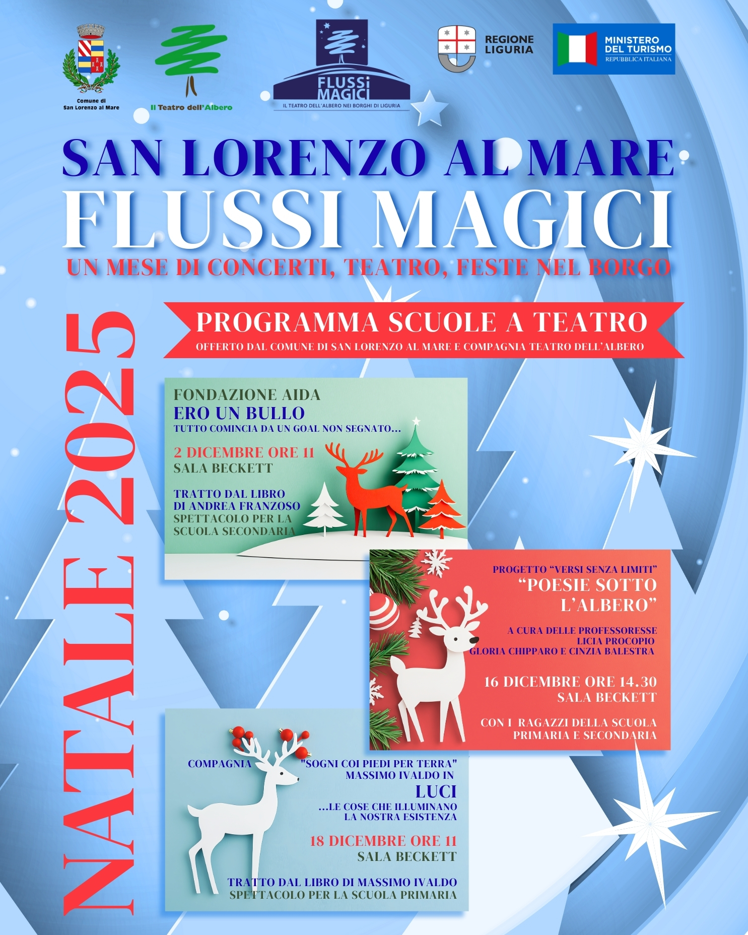 Successivamente, il 18 dicembre alle ore 11:00, gli alunni della scuola primaria vedranno lo spettacolo “Luci!” di Massimo Ivaldo. Questo lavoro poetico è dedicato ai bambini e celebra la luce attraverso la metafora delle “Sette Luci”, espressione di armonia e gioia. Inoltre, Massimo Ivaldo sarà nuovamente presente il 21 dicembre con la sua animazione “I giochi di ancora una volta!” alla festa di Natale per bambini organizzata dal Comune di San Lorenzo al Mare in collaborazione con la Pro Loco San Lorenzo al Mare, dalle ore 14:00 presso il Parco Giochi di via Vignasse.