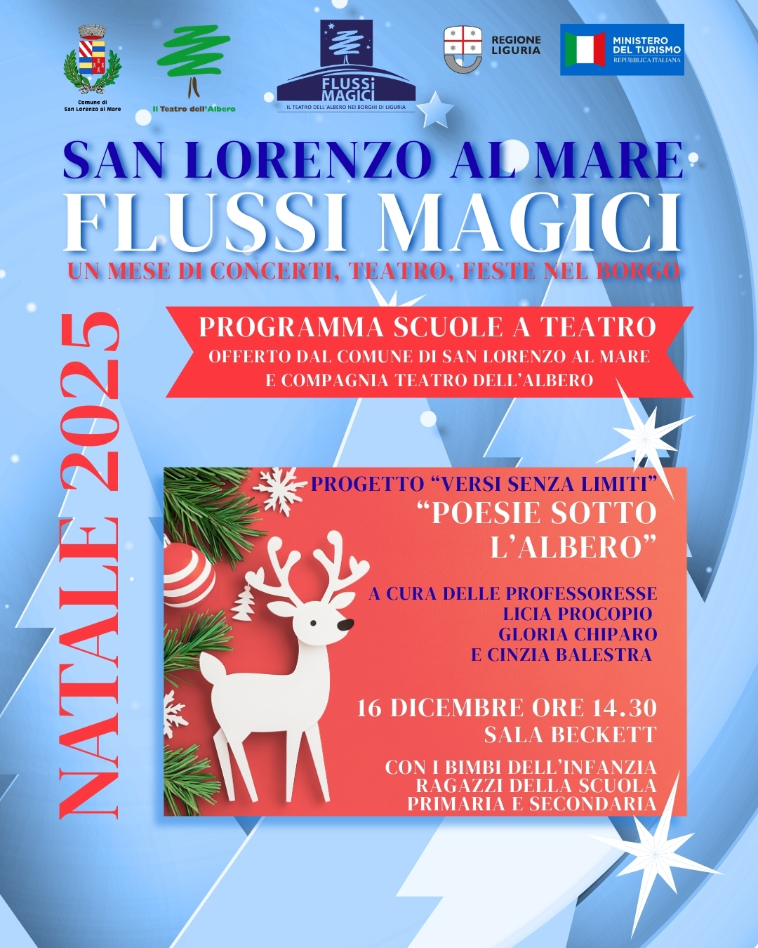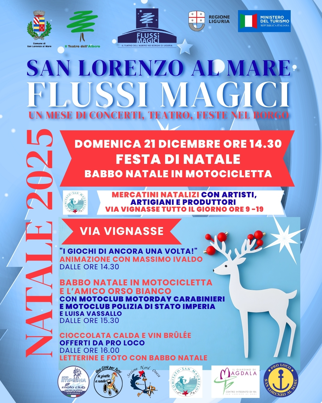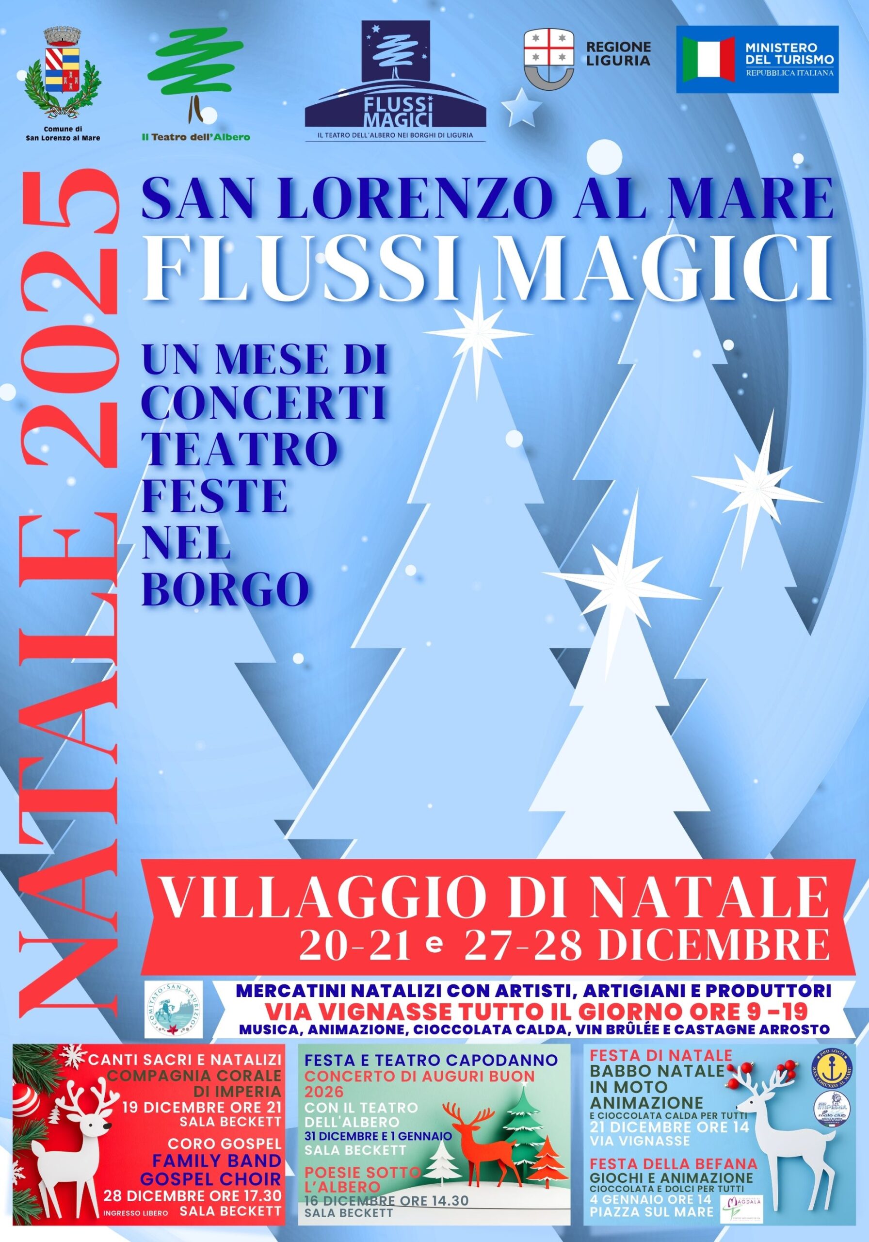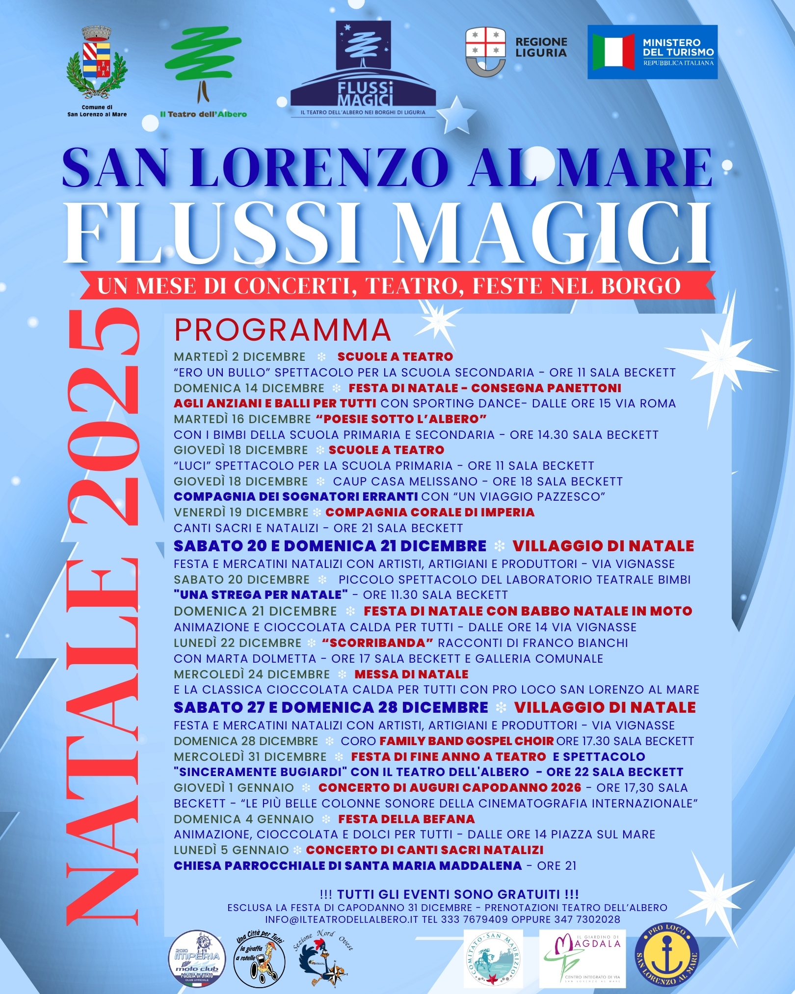 “Flussi Magici – Natale 2025” è un invito a vivere l’atmosfera natalizia riscoprendo il piacere di stare insieme, tra cultura, spettacolo e le tradizioni più sentite. Un’occasione unica per i residenti e i visitatori per immergersi nella magia del Natale. Direzione artistica de Il Teatro dell’Albero, con il contributo ottenuto dal Comune di San Lorenzo al mare, a valere sul FUNT di Regione Liguria e Ministero del Turismo.