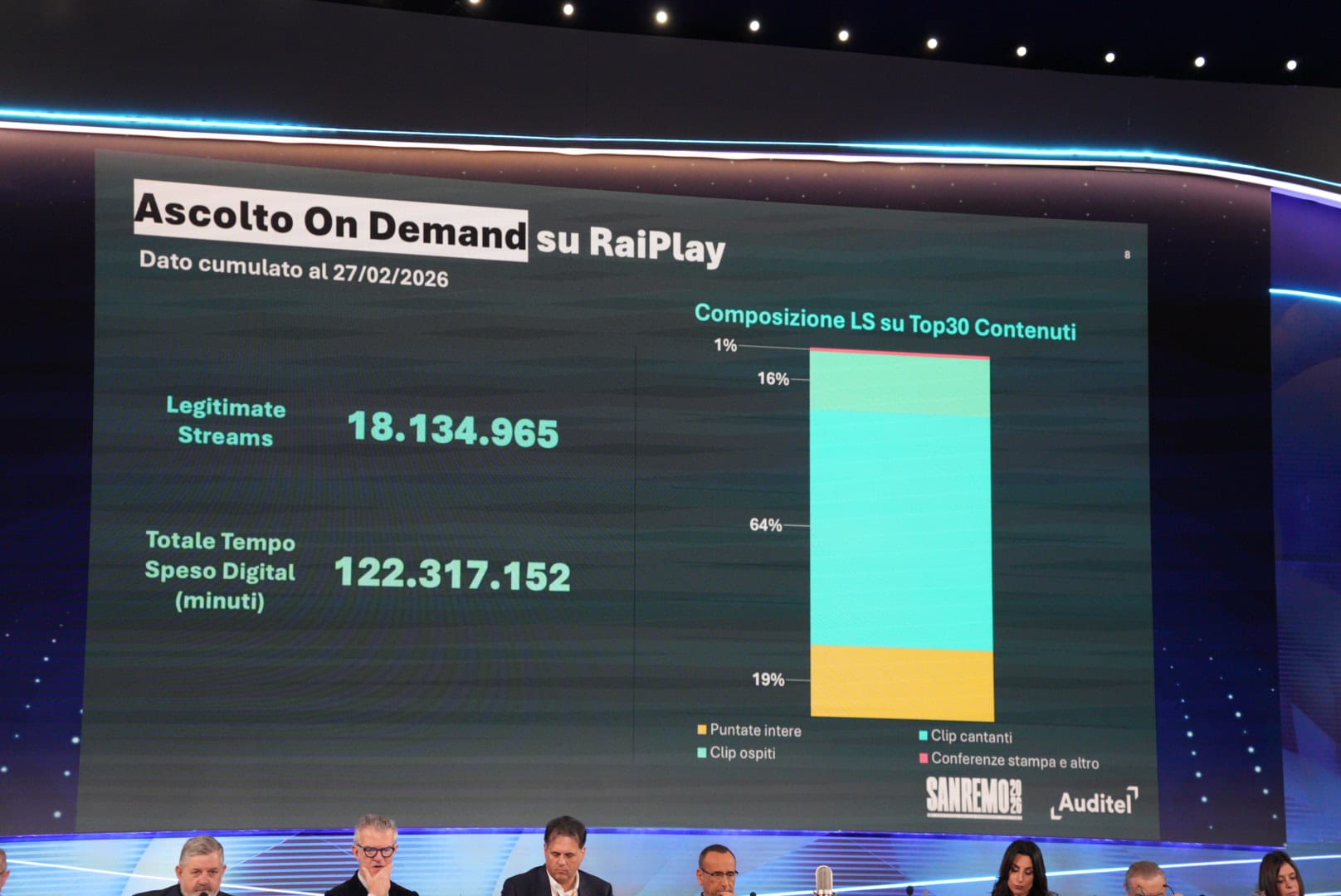 “Un Festival in continua crescita, con nessuna flessione in termini di share. Dal 1995 ad oggi è al quarto posto come share delle quarte serate. Un Festival molto visto dai giovani, ottimi risultati dal punto di vista social”, ha commentato l’organizzazione.