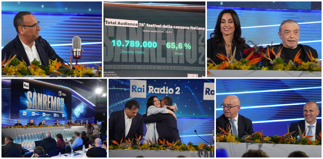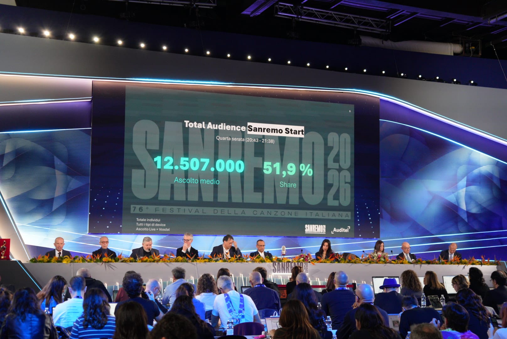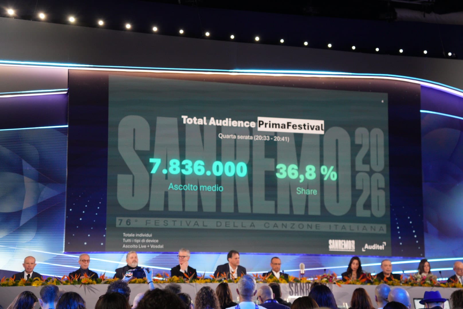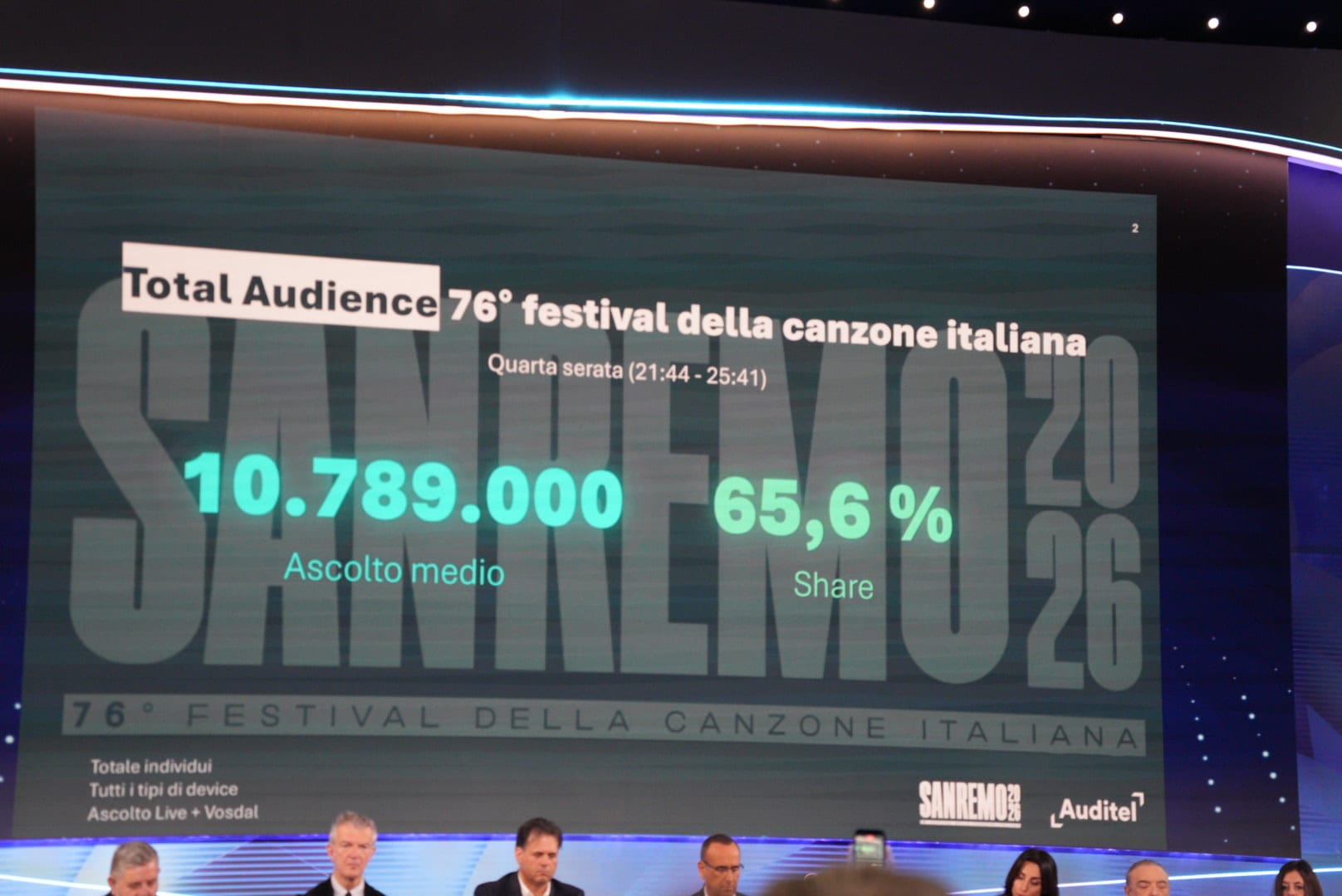 Sono stati 10 milioni 789 mila, con uno share del 65.6 per cento, i telespettatori che – secondo la Total Audience rilasciata da Auditel – hanno visto la quarta serata del 76esimo Festival della Canzone italiana.