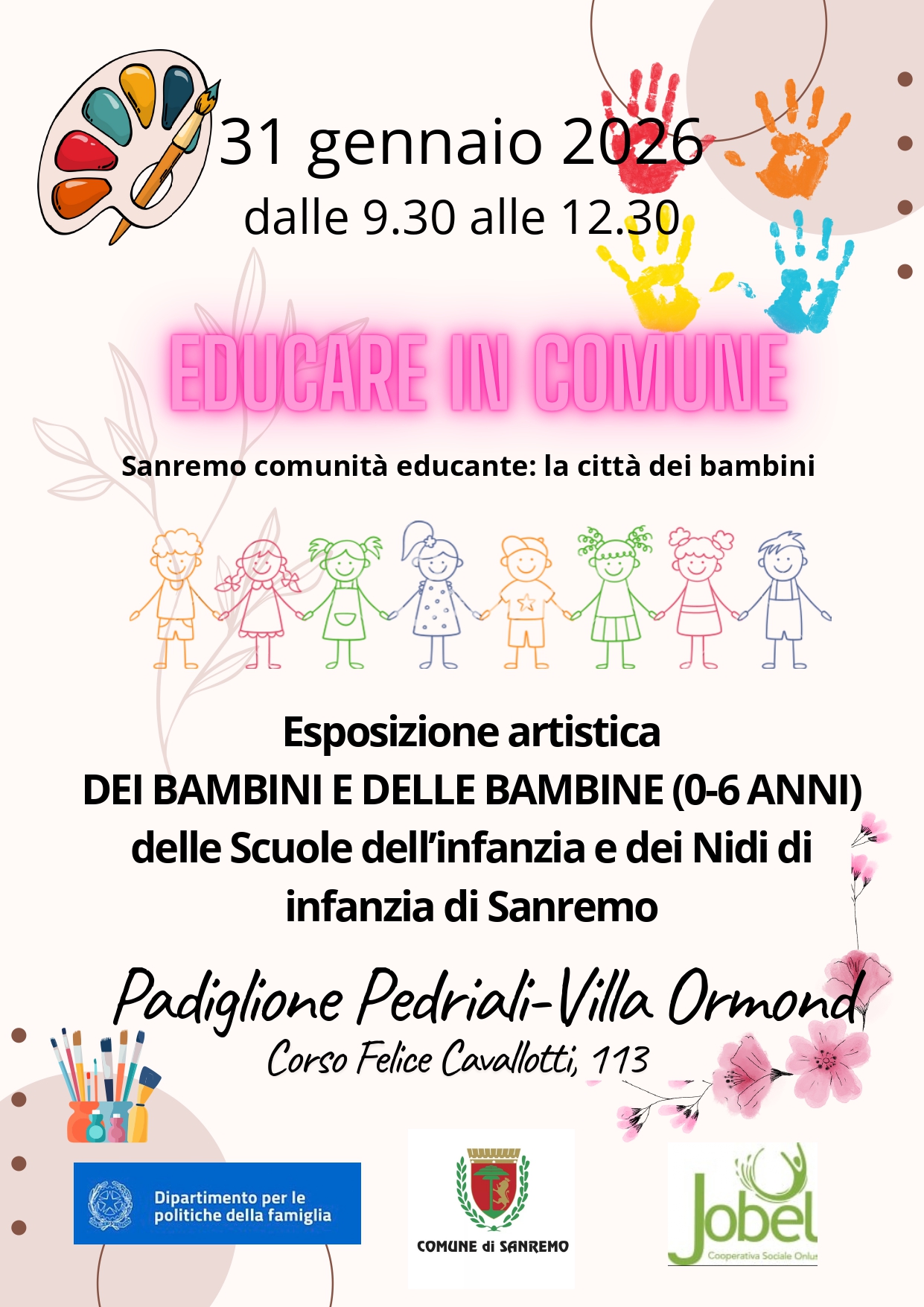 Si terrĂ sabato 31 gennaio, al padiglione Pedriali di Villa Ormond, dalle ore 930 alle 12:30, la presentazione dei primi risultati del progetto âEducare in Comune – Sanremo comunitĂ educante: la cittĂ dei bambiniâ. Durante lâevento, aperto alla cittadinanza, saranno mostrati gli elaborati prodotti dai bambini delle scuole dellâinfanzia e dei nidi nei primi mesi di attivitĂ .