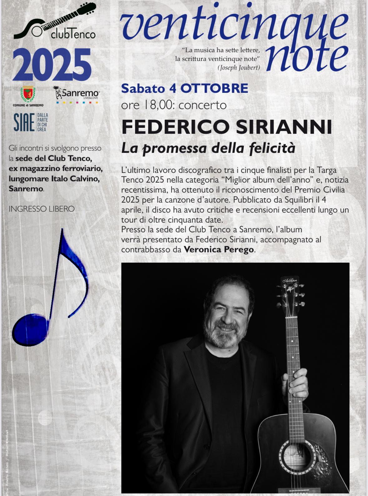 Sabato 4 ottobre, alle ore 18.00, a Sanremo, la sede del Club Tenco, presso l’ex scalo merci della vecchia stazione ferroviaria (piazza Cesare Battisti 33), ospiterà il concerto del cantautore Federico Sirianni La promessa della felicità. L’artista sarà accompagnato dalla contrabbassista Veronica Perego.