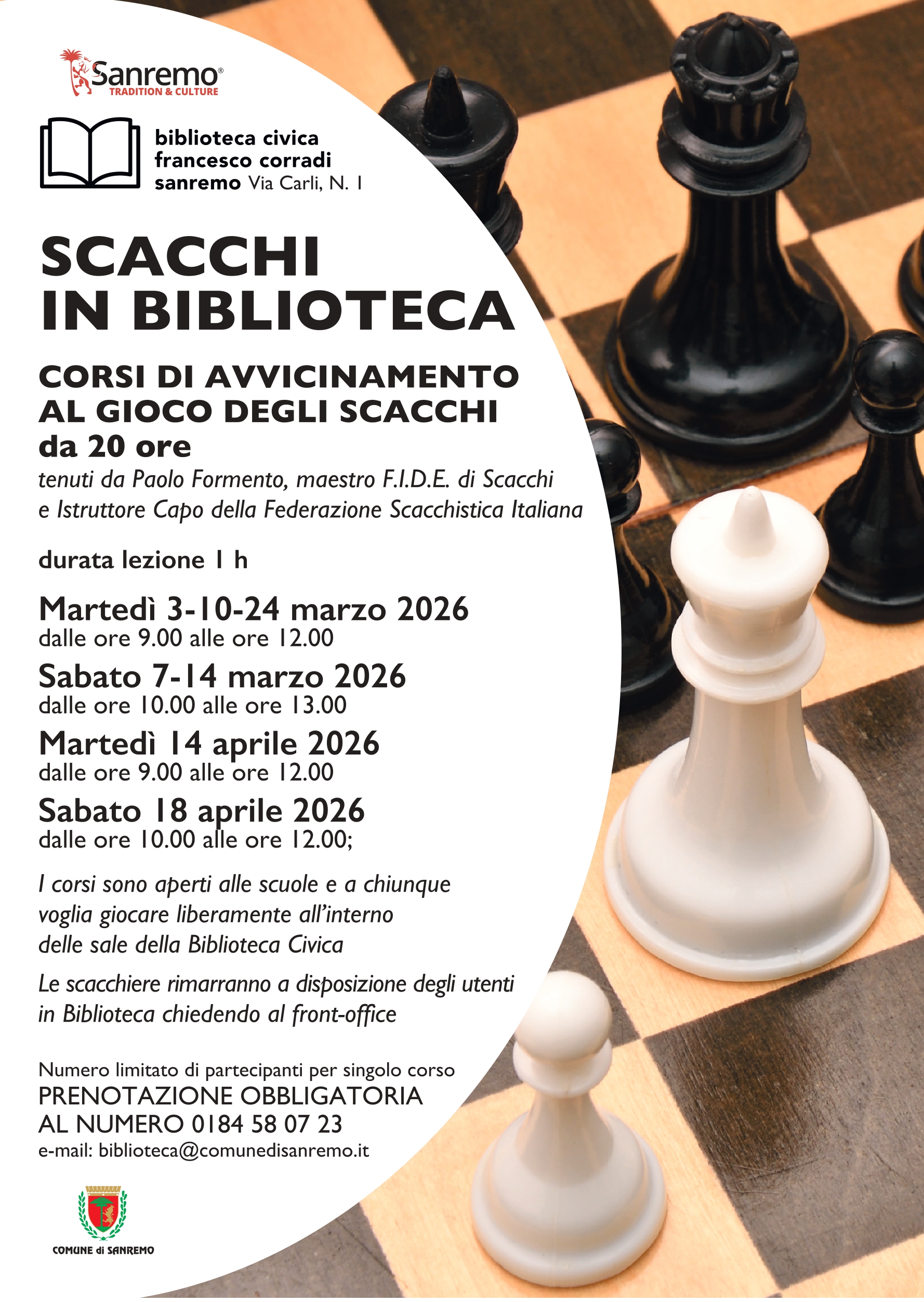 Le scacchiere rimarranno a disposizione degli utenti, chiedendo al front-office della biblioteca. Il numero dei partecipanti è limitato, è quindi necessaria la prenotazione inviando una mail all’indirizzo biblioteca@comunedisanremo.it oppure telefonando al numero 0184 580723.