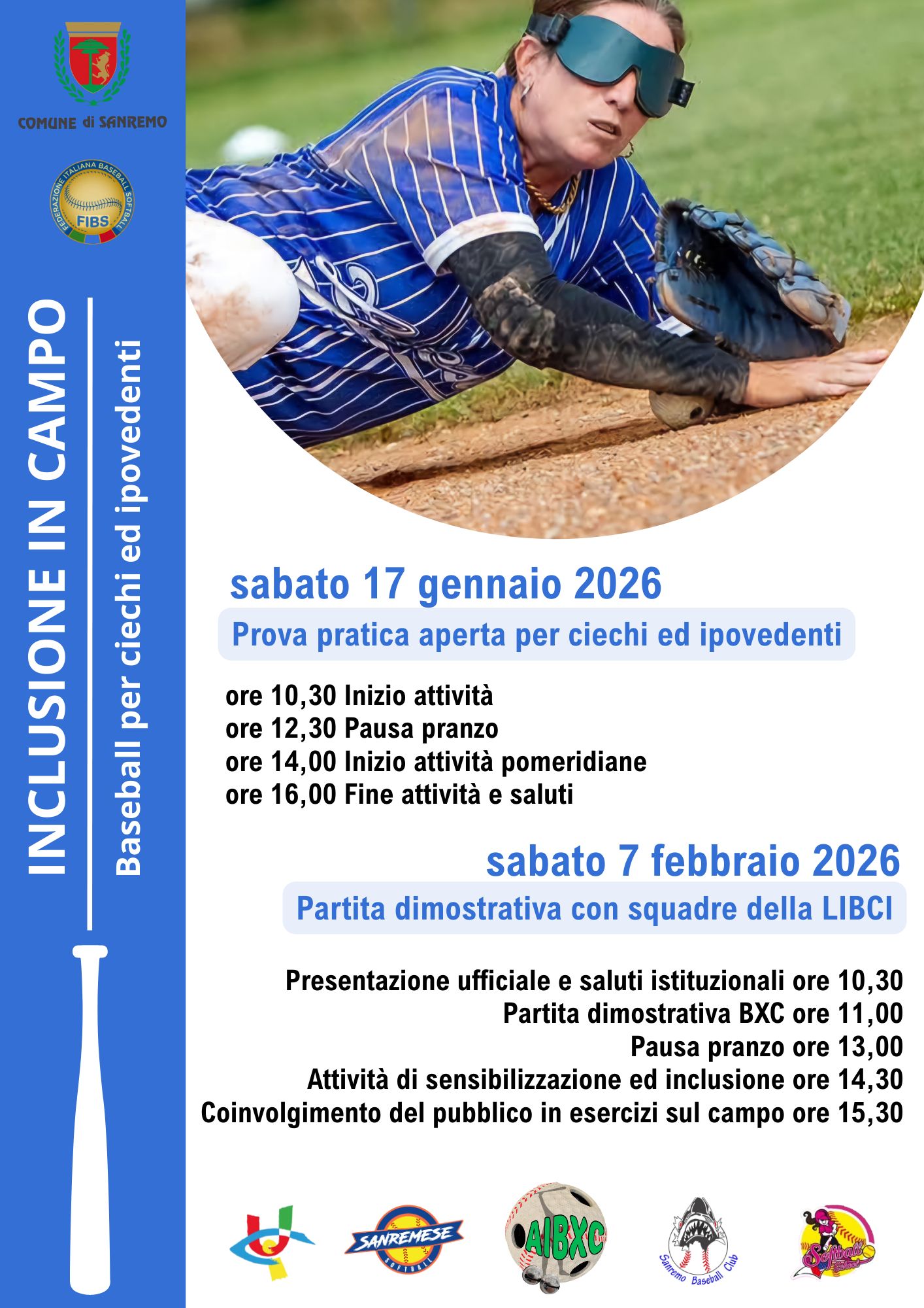 Sanremo si prepara ad ospitare “Baseball per Ciechi – Inclusione in Campo”, progetto promosso da Sanremese Softball ASD, UICI – sezione territoriale di Imperia e Sanremo Baseball Club, in collaborazione con AIBXC (Associazione Italiana Baseball per Ciechi e Ipovedenti) e FIBS (Federazione Italiana Baseball Softball).
