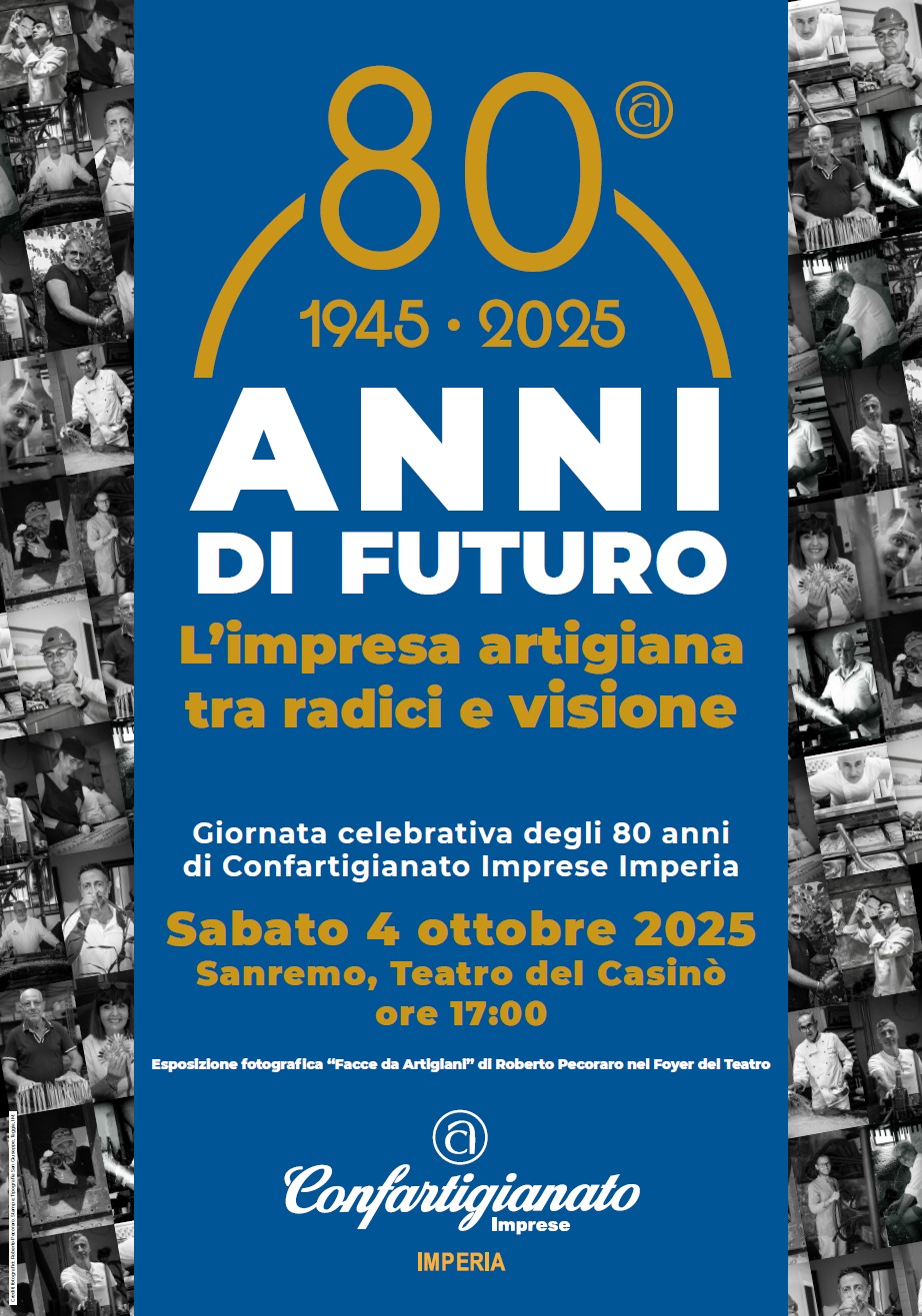 Appuntamento domani, sabato 4 ottobre, alle ore 17 presso il Teatro del Casinò di Sanremo, per la cerimonia degli 80 anni di Confartigianato Imperia. Una giornata che vuole celebrare la storia dell’associazione di artigiani con le tante iniziative messe in campo in questi otto decenni e l’attività svolta al fianco delle imprese.