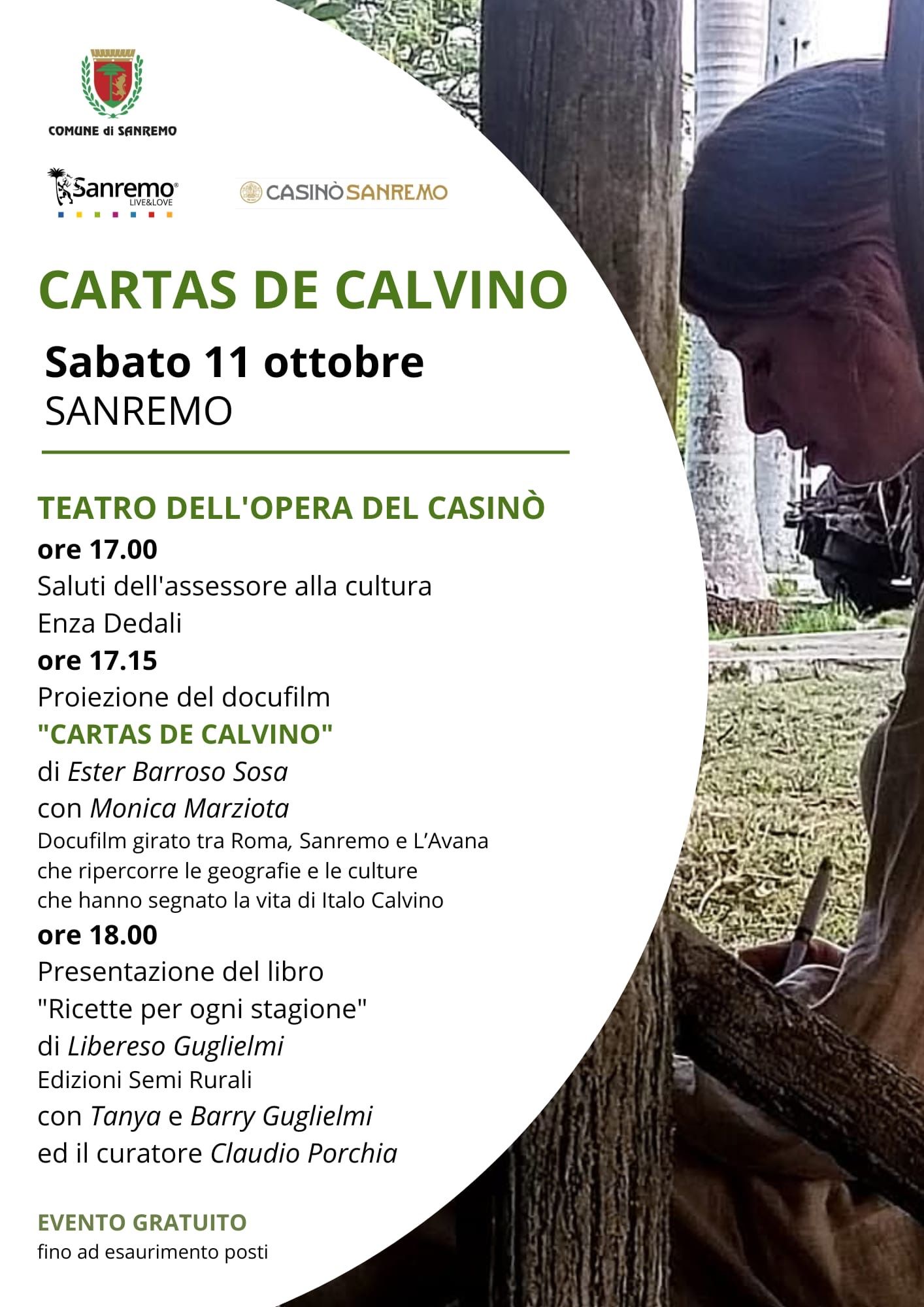 Alle 17.15 verrà proiettato il docufilm “Cartas de Calvino” della regista Esther Barroso Sosa, con la partecipazione dell’attrice e cantante Monica Marziota. Un viaggio suggestivo attraverso tre città – Sanremo, L’Avana e Roma – per raccontare le radici, i paesaggi e le atmosfere che hanno segnato la vita di Italo Calvino. In questo percorso, la figura di Libereso ritorna come simbolo dell’infanzia dello scrittore e del suo amore precoce per la natura. Tra testimonianze, ricostruzioni e una colonna sonora evocativa, il film diventa un tributo intenso e poetico al legame tra Calvino e il suo giardiniere (durata: 47 minuti).