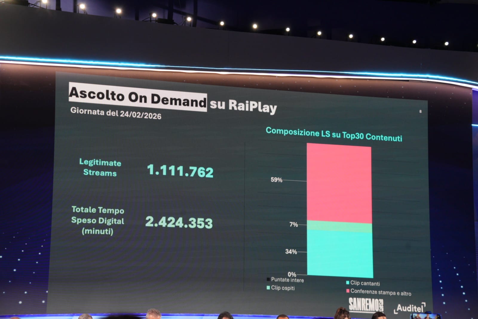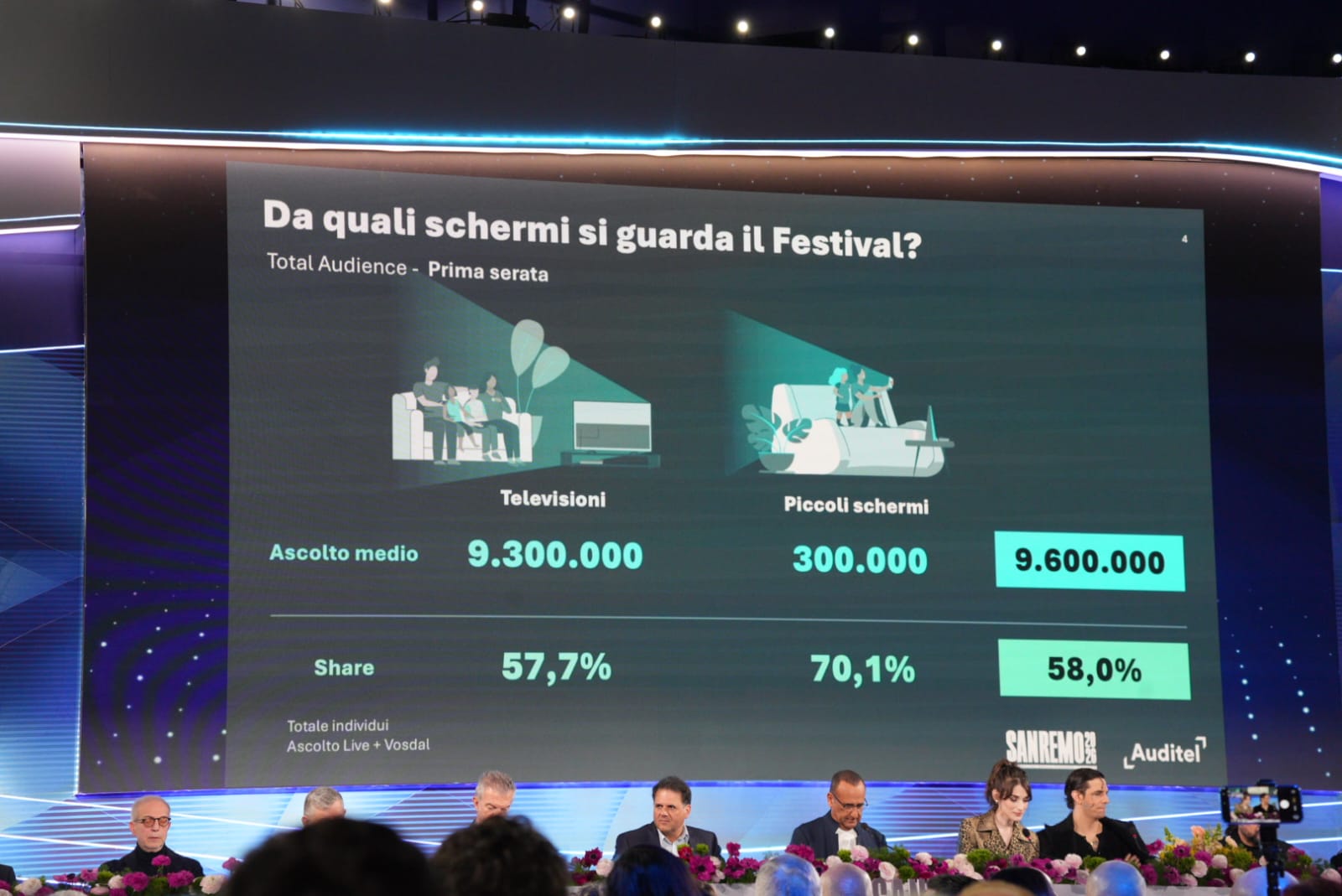 Dati alla mano, la prima serata del Festival ha fatto registrare – secondo la Total Audience rilasciata da Auditel – 9 milioni 600 mila telespettatori con il 58% di share.