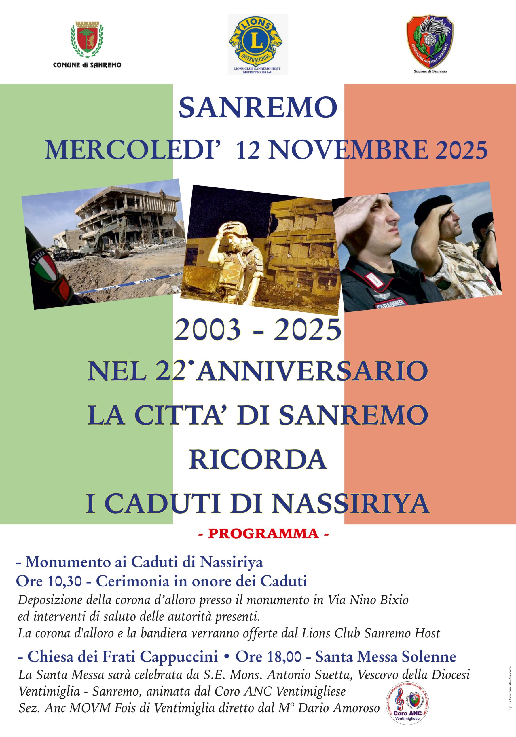 Mercoledì 12 novembre l’amministrazione comunale Sanremo, in collaborazione con l’Associazione Nazionale Carabinieri – sezione Sanremo, ricorda i Caduti di Nassiriya nel 22esimo anniversario.