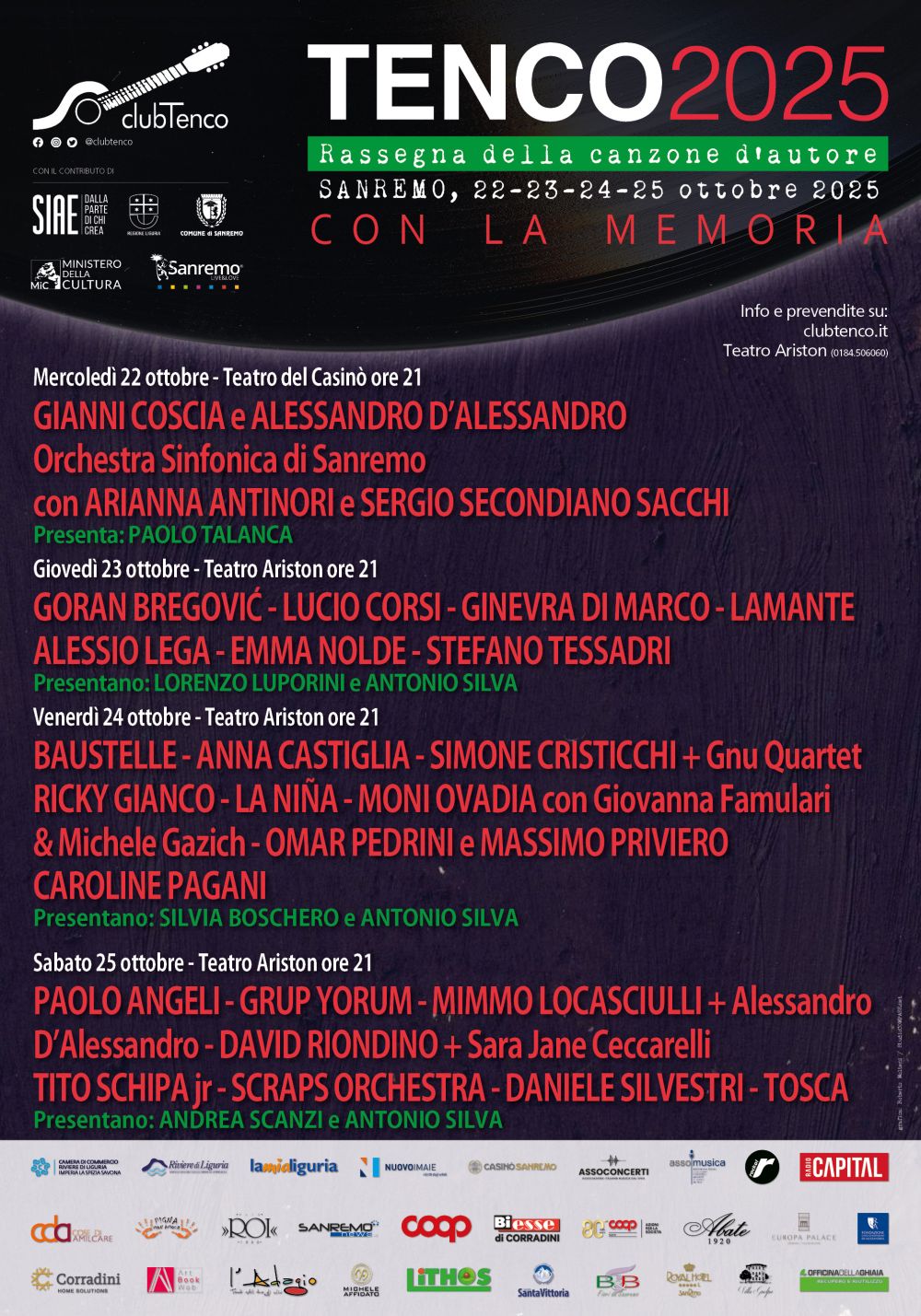 La rassegna comprende nel suo programma, oltre alle tre serate, eventi, proiezioni, presentazioni, incontri e spettacoli pomeridiani a partire dal 22 ottobre in tutta la città simbolo della musica italiana, dalla sede del Club Tenco nell’ex scalo merci della vecchia stazione ferroviaria al Teatro Casinò, dall’Ex chiesa Santa Brigida nel quartiere Pigna al Cinema Ritz.