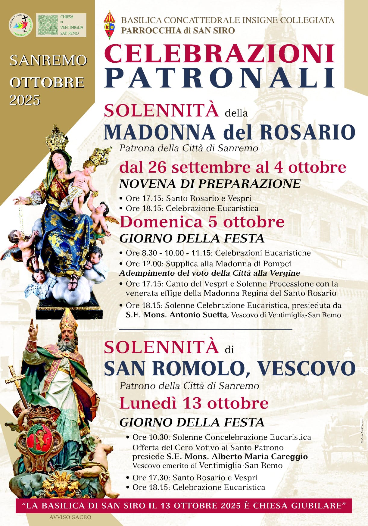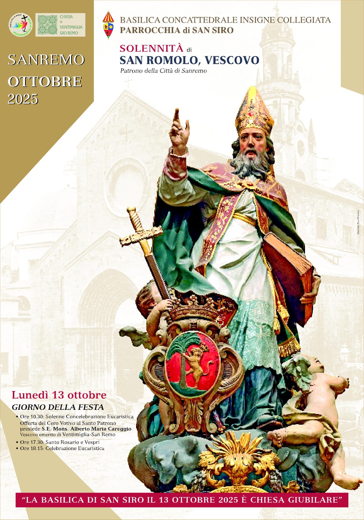 Il 13 ottobre, poi, festa patronale per la Solennità di San Romolo, si svolgeranno manifestazioni civili e religiose. Nella concattedrale di San Siro, alle ore 10.30, si terrà la celebrazione solenne presieduta dal Vescovo emerito, monsignor Alberto Maria Careggio. Nella giornata la Basilica di San Siro sarà Chiesa Giubilare. Durante la celebrazione verrà offerto il cero votivo al Santo Patrono. L’animazione della liturgia vedrà il coinvolgimento della Cappella Musicale Diocesana.