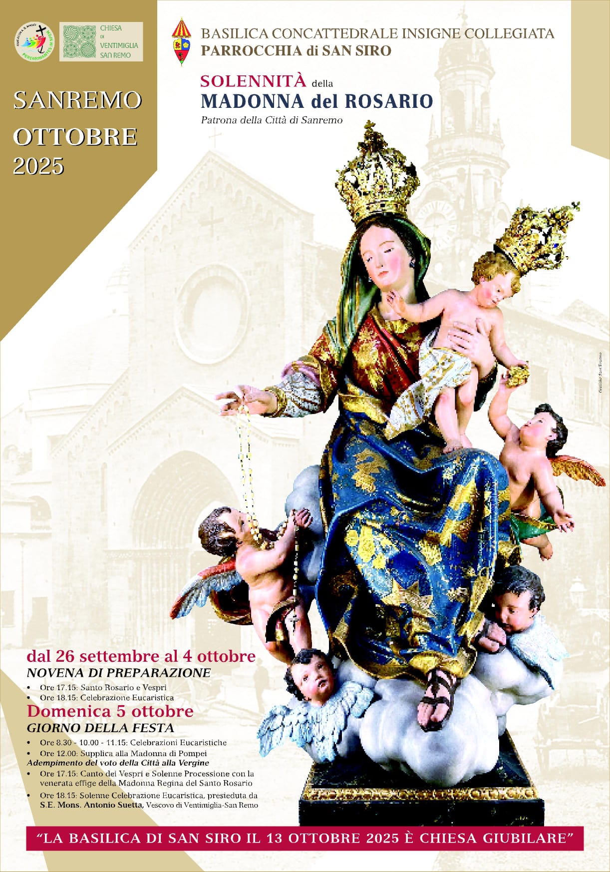 Domenica 5 ottobre, in occasione della festa per la Madonna del Rosario, a San Siro si svolgerà la solenne celebrazione eucaristica presieduta da S.E. monsignor Vescovo Antonio Suetta e preceduta dalla consueta processione per le vie cittadine. Il culto verso la Madonna del Rosario è di antica tradizione e molto sentito non solo a Sanremo, ma in tutto il mondo; alle ore 12 ci sarà la Supplica per l’adempimento del voto della città alla Vergine. In questi giorni è in corso la Novena in preparazione: tutti i pomeriggi alle ore 17.15, con a seguire la Messa vespertina.