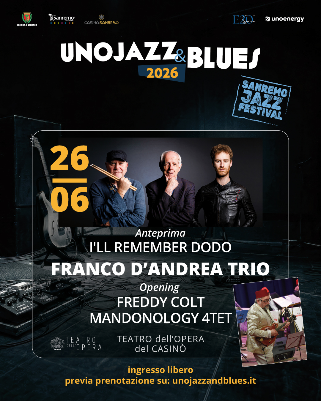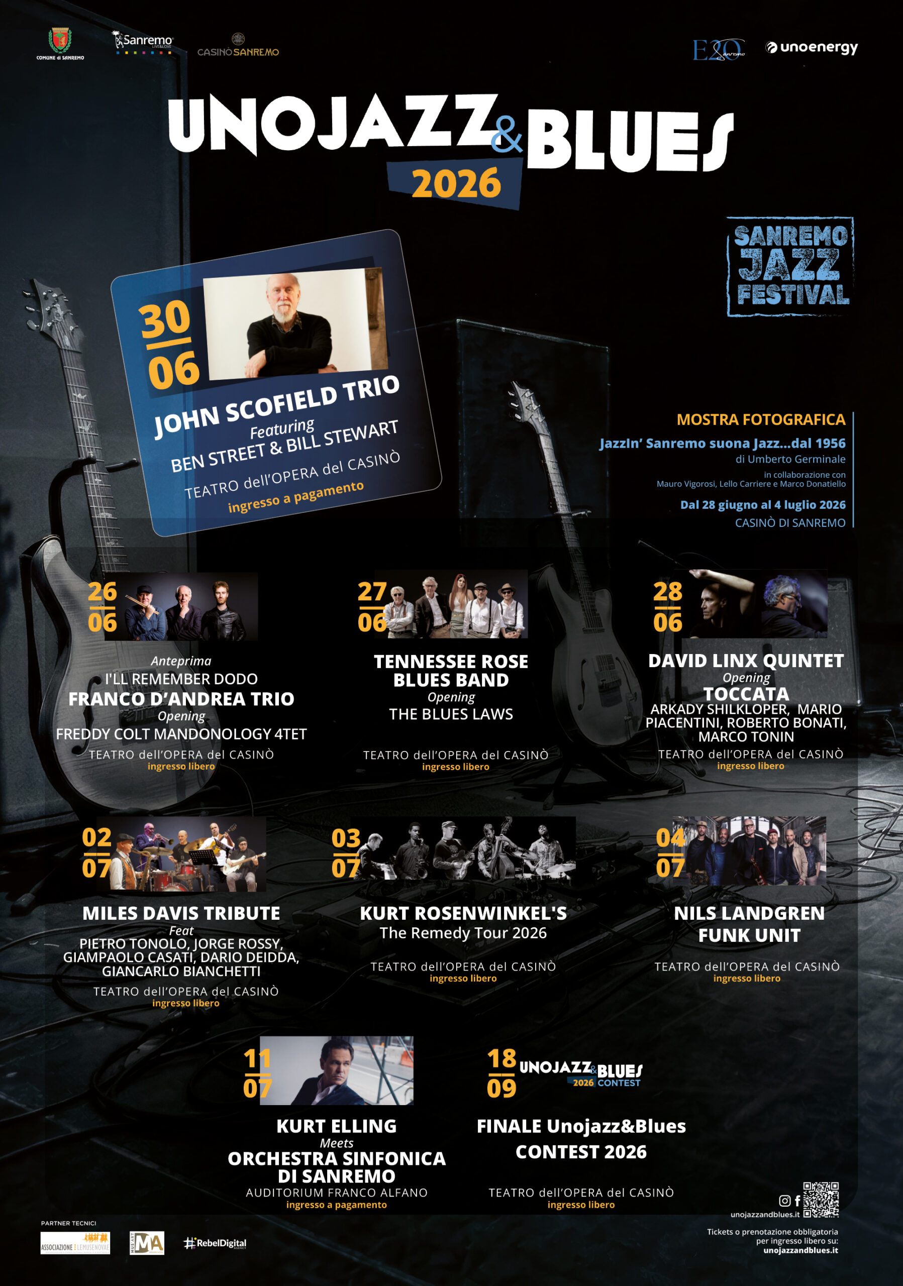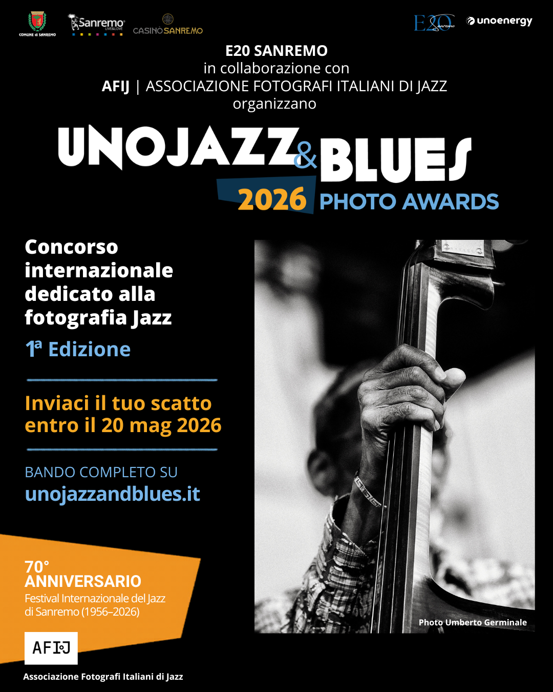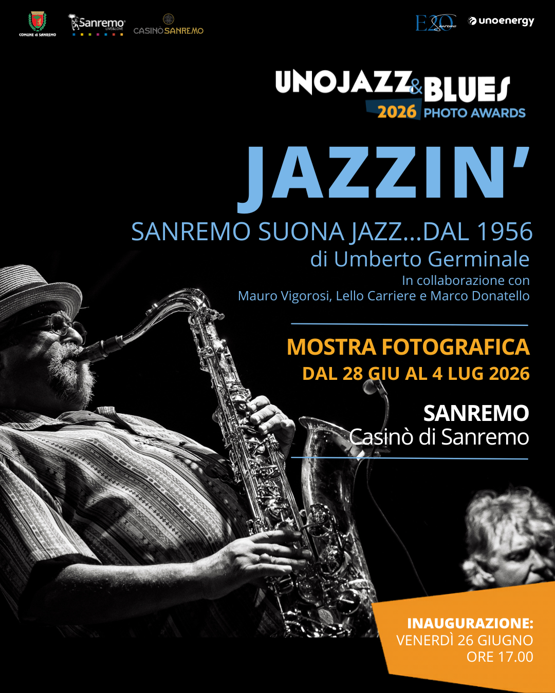 Ma non è finita. UnoJazz&Blues per questa edizione 2026 si arricchisce di nuovi eventi che coinvolgono l’arte e la fotografia con la mostra fotografica di Umberto Germinale “Jazz’in… Sanremo suona jazz… dal 1956” e la prima edizione di un concorso internazionale di fotografia dedicato al jazz, in collaborazione con AFIJ – Associazione Fotografi Italiani di Jazz.