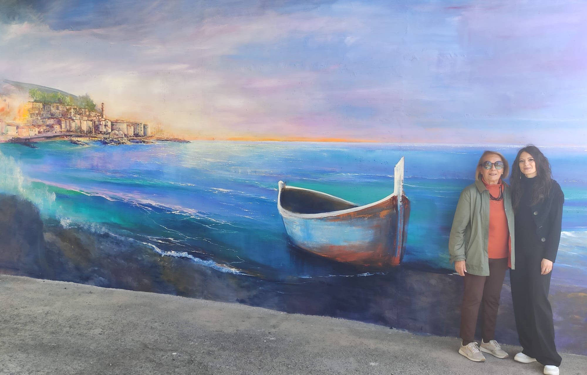L’artista Valentina Martini, nel rispetto della sacralità del luogo, ha interpretato il progetto attraverso un linguaggio visivo fatto di colori e simboli: il mare e le onde come custodi dei ricordi, il paese come segno identitario e una barca spiaggiata come metafora del legame con le proprie radici. Un’opera che unisce dimensione terrena e spirituale, trasformando il muro in uno spazio di contemplazione.