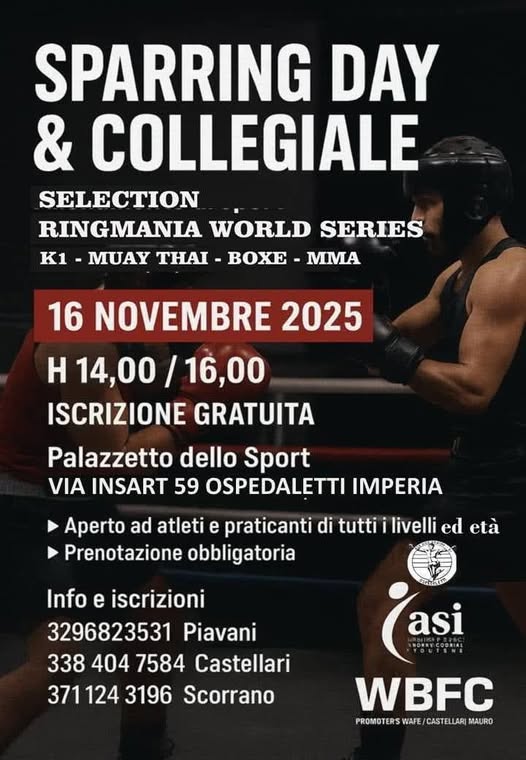 Il Palazzetto dello Sport di via Isnart domenica 16 novembre, dalle ore 14 alle ore 16, ospita un importante evento dedicato agli sport da combattimento. Organizzato dalla WBFC (World Boxing Fighters Corporation) del presidente Franco Scorrano – responsabile nazionale ASI degli sport da combattimento moderno – e dal vicepresidente Alessandro Piavani, con la fondamentale collaborazione locale del Maestro Mauro Castellari di Ospedaletti.